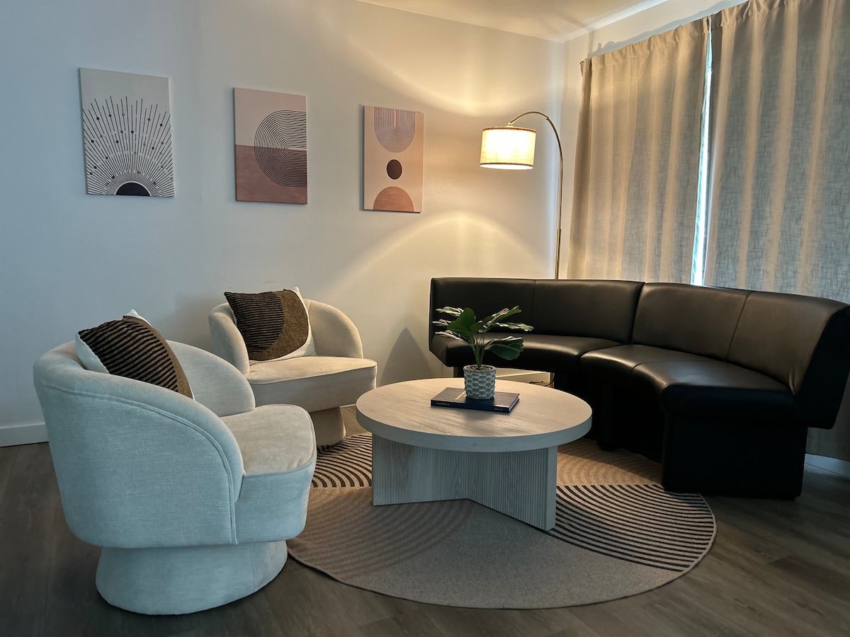 Entspanne dich in diesem gehobenen modernen Rückzugsort mit einem riesigen privaten Garten ★ 3 gemütliche Schlafzimmer | 1,5 moderne Badezimmer | Platz für 9 Gäste ★ Lustiges Spielzimmer: Der perfekte Indoor-Treffpunkt für deine Gruppe ★ Breite Hinterhof-Oase: Viel Platz für Kinder und Spiele im Freien ★ Überdachter Parkplatz auf der Veranda: Sicherer und bequemer Eingang vor dem Haus • Moderner Stil | Familienorientiert | Kostenlose Grundausstattung • Schnelles Internet | Bereit für Remote-Arbeit • Frische Bettwäsche | Vollständige Wäscherei
