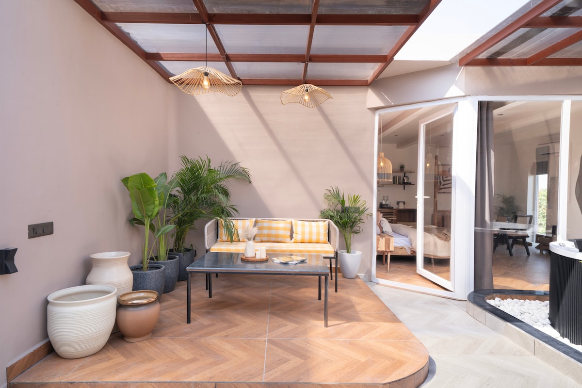 Nestled on a lush 2-acre farm, the three uniquely designed 700 sq ft A-frame cottages offer double occupancy & their private lawns. An infinity pool overlooking horse stables & paddocks anchors the property, blending rustic charm with refined luxury. Inside, plush mid-century interiors feature round mirrors, automated skylights, mood lighting & elegant symmetry. With peacocks & horses roaming the grounds, the setting promises a truly unique & immersive experience.