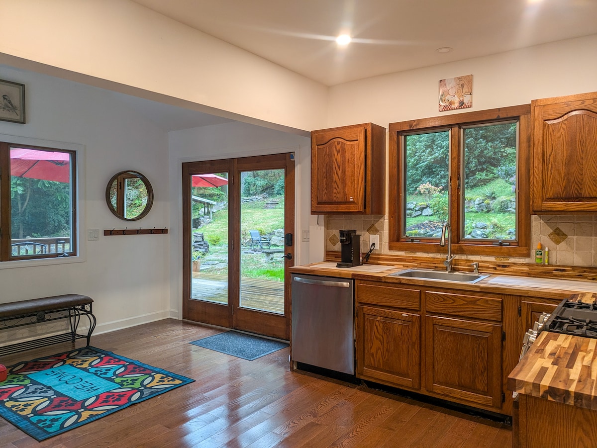 Genieße frische Luft und eine ruhige Aussicht von der Terrasse im 2. Stock eines 1 Hektar großen Grundstücks mit einem angrenzenden Apfelgarten. Rustikales Dekor vermischt sich mit industriellem Flair, um ein inspirierendes Interieur zu schaffen, das ländlichen Komfort zusammen mit modernen Annehmlichkeiten bietet. Genieße Hartholzböden, Queensize-Matratzen aus Memoryschaum, hohe Decken, ein Tastaturtürschloss (keine Schlüssel erforderlich), schnelles WLAN, eine zentrale Klimaanlage und eine private Terrasse. Wir freuen uns schon sehr darauf, dich als Gast begrüßen zu dürfen! Dies ist eine Immobilie mit mehreren Einheiten, daher verbieten wir Partys und Veranstaltungen.