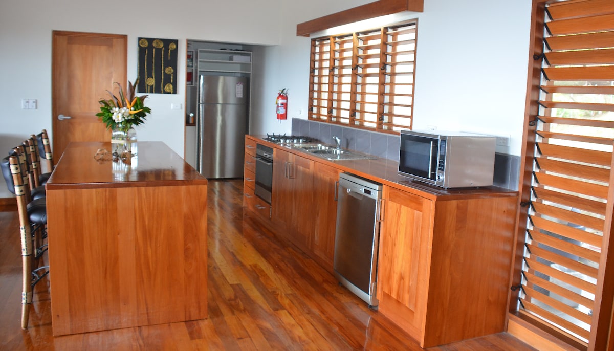 Ein Haus mit zwei Schlafzimmern und zwei Badezimmern mit Klimaanlage in der Maui Bay an der Korallenküste von Fidschi. Auf einem Hügel gelegen, nur wenige Minuten vom Strand entfernt (2 Minuten Fahrt), kannst du sowohl den atemberaubenden Meerblick als auch die kühlen Passatwinde genießen. Unsere Hausmeisterin begrüßt dich bei deiner Ankunft und bietet dir von Montag bis Freitag von 9:00 bis 16:00 Uhr einen Reinigungsservice. Sie kann auch babysitten, dich zum Einkaufen begleiten sowie Currys und frische Roti kochen, die viele Gäste sich von ihr beibringen lassen. Kostenloses WLAN und ein Wasserfiltersystem.