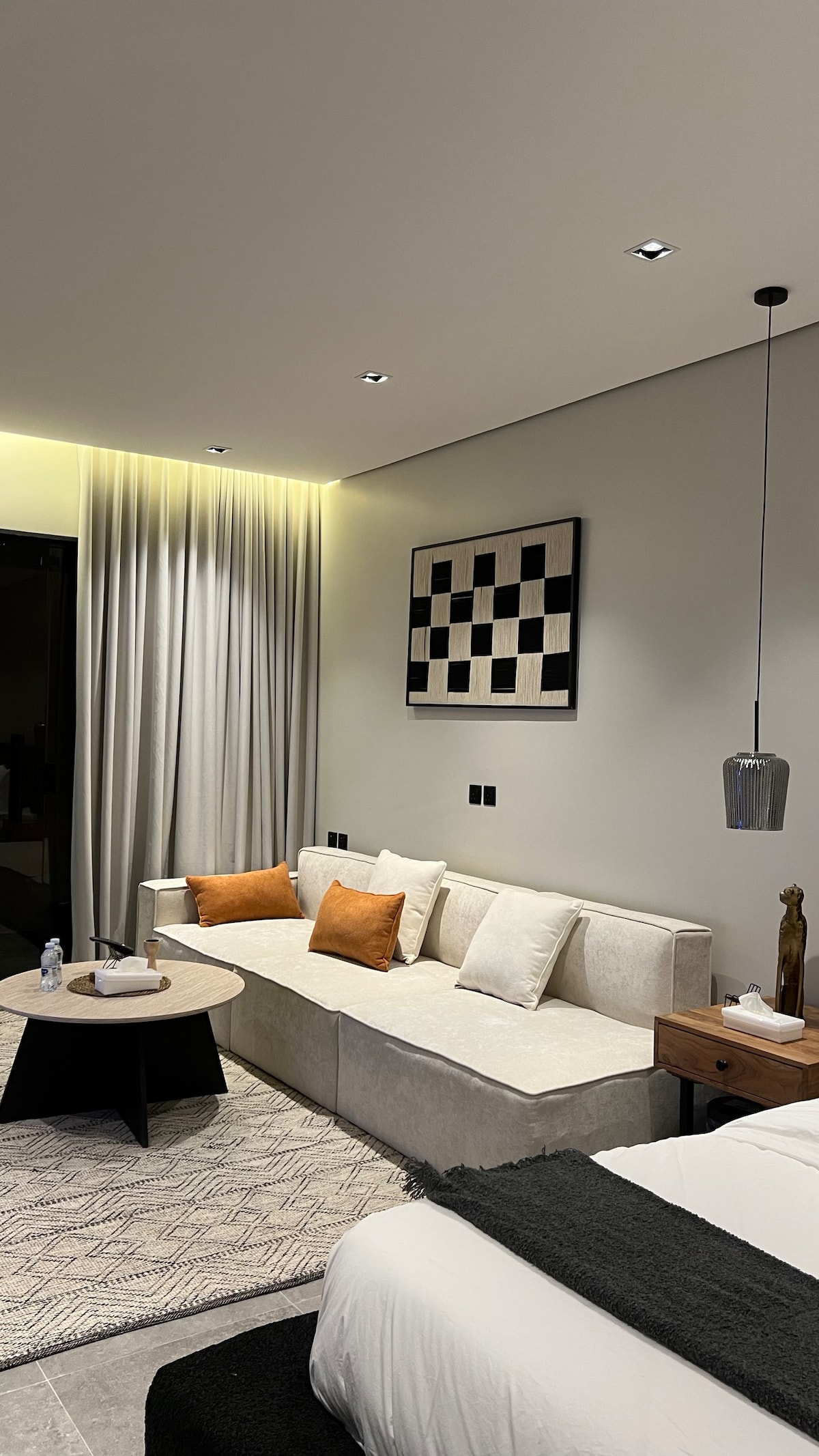 Eine moderne Wohnung, die für einen außergewöhnlichen Aufenthalt entworfen wurde und sich in einem der schönsten Viertel von Riad mit einem atemberaubenden Blick auf KAFD befindet. Sie verfügt über einen Sitzbereich im Freien mit einem Bildschirm und einem Projektor für angenehme Abende. Für deinen Komfort enthält das Bett eine hochwertige 14 cm dicke Zusatzschicht. „Wir bieten auch Event-Koordinationsdienste für besondere Anlässe (einschließlich Kuchen und Zubehör) gegen eine zusätzliche Gebühr mit vorheriger Buchung an, um ein unvergessliches Erlebnis zu gewährleisten.“