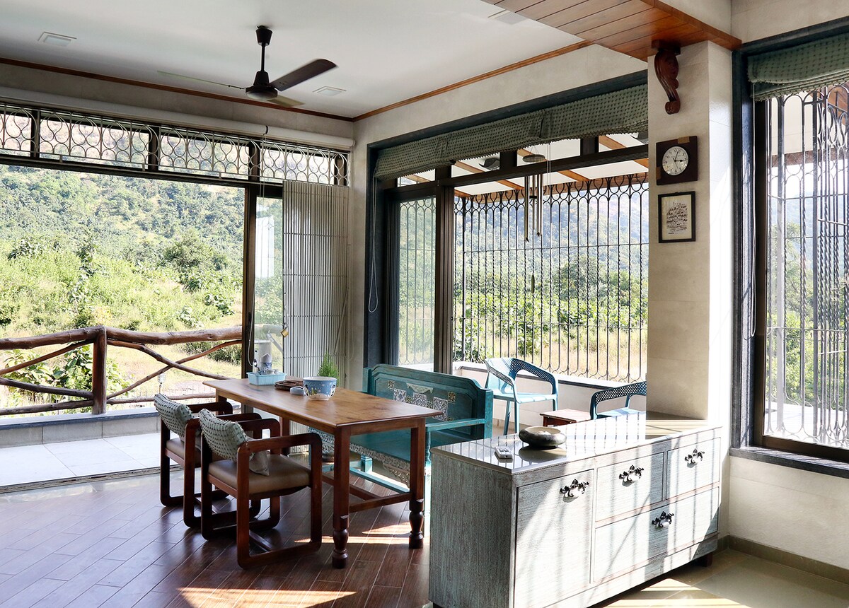 Komm an diesem unvergleichlichen Rückzugsort, der von hohen Bäumen umgeben ist, wieder in Einklang mit der Natur. Entspanne und erhole dich in einem schönen Bungalow mit großartiger Ästhetik, der auf Komfort für Familien und Paare ausgelegt ist. Der Bungalow ist privat und ruhig und bietet einen atemberaubenden Blick auf die Sahyadri-Bergkette. Mit beruhigenden Naturwanderungen in einem weitläufigen über 7 Hektar großen Grundstück und einem privaten Zugang zum Fluss Ulhas wird dieser Bauernhofaufenthalt deinen Aufenthalt sicherlich zu einem unvergesslichen Erlebnis machen.