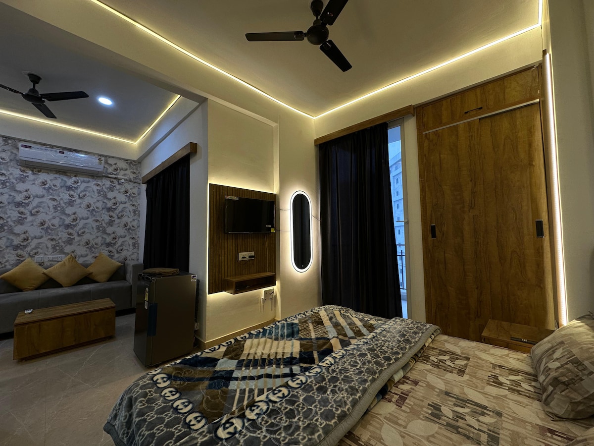 Willkommen bei Trovero Suites! Das Hotel liegt im Herzen von Greater Noida, in der Nähe von Expo Mart (8 km) Was dir gefallen wird: ✔ Privater Balkon – Genieße den faszinierenden Blick auf die Häuserreihe ✔ Erstklassige Lage – In der Nähe von Top-Sehenswürdigkeiten, Restaurants ✔ Moderner Komfort – Ein wunderschön eingerichteter Raum mit einem bequemen Bett, gemütlichen Sitzgelegenheiten und stilvoller Einrichtung ✔ Voll ausgestattete Küche – koche deine Lieblingsgerichte mit Leichtigkeit ✔ Schnelles WLAN & Smart TV – Bleibe in Verbindung und unterhalte dich. ✔ Ruhiges Ambiente – ein ruhiger, luxuriöser und privater Rückzugsort