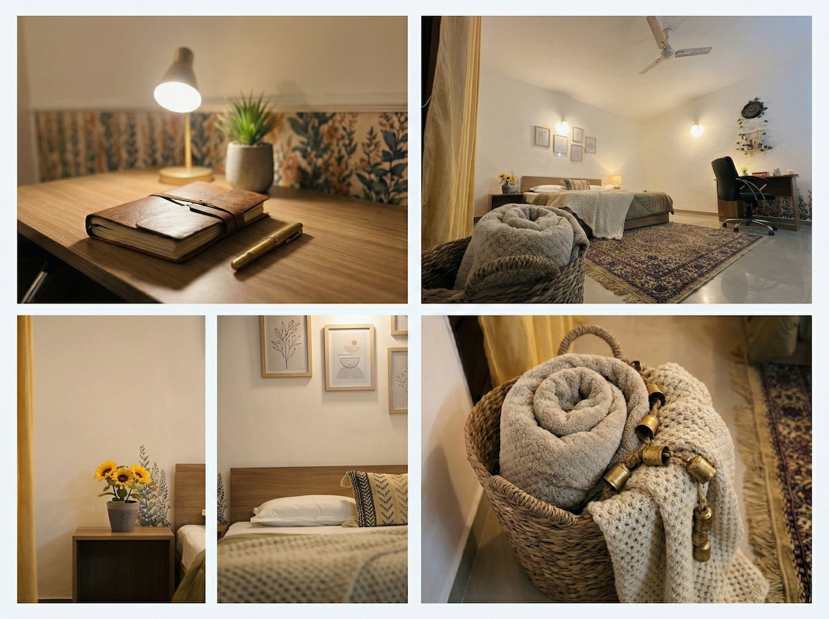 Willkommen im Amora by Shrisaa Homes, deinem warmen und einladenden Studio-Retreat mitten im Herzen von Vrindavan. Dieses Studio-Apartment ist durchdacht mit einem beruhigenden braunen und goldenen Thema gestaltet und eignet sich perfekt für Paare, die einen romantischen Kurzurlaub suchen, Familien, die einen komfortablen Aufenthalt wünschen, oder Alleinreisende, die einen gemütlichen Raum zum Entspannen suchen, nachdem sie den spirituellen Charme von Vrindavan erkundet haben.