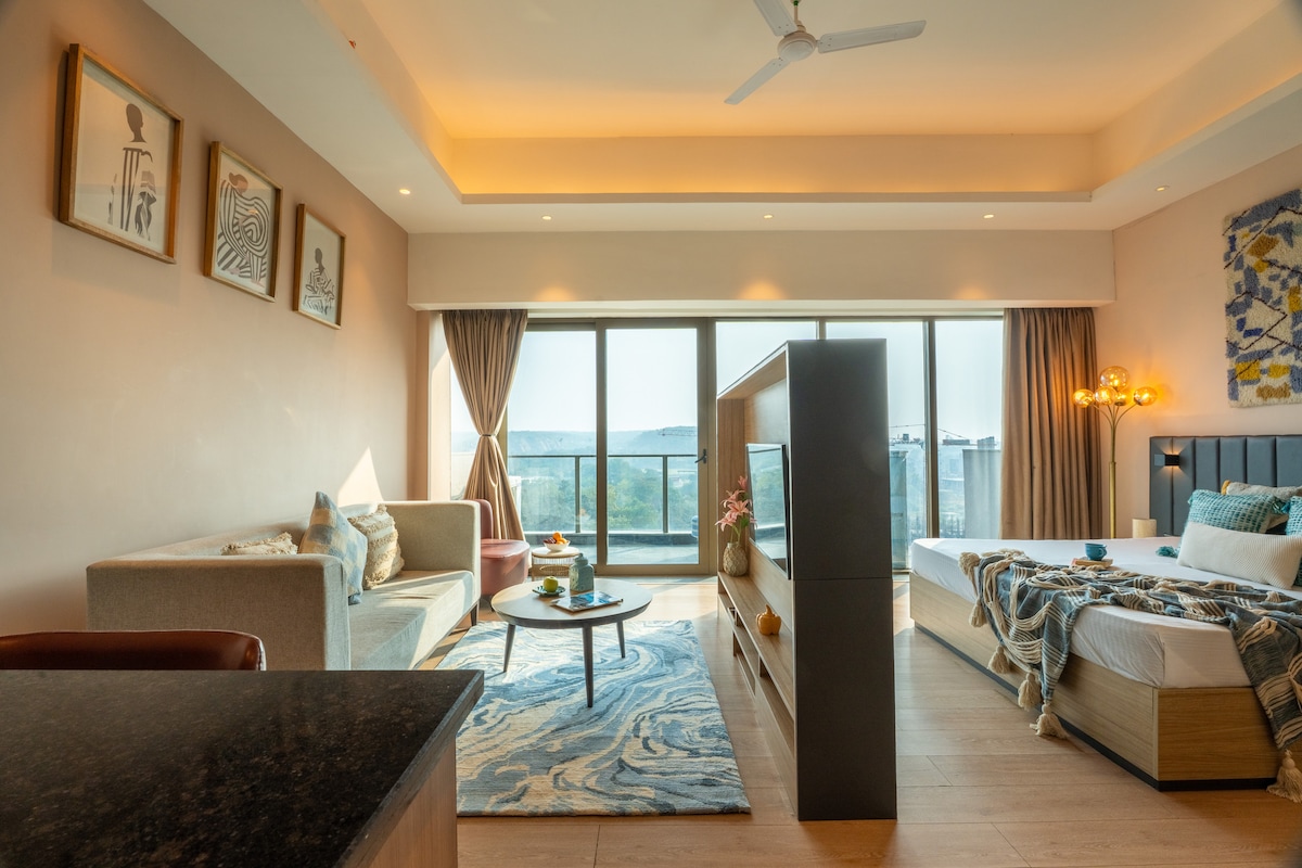 Mach es dir in diesem einzigartigen und ruhigen Rückzugsort bequem. Wache im Penthaus Studio 17, einem hellen und stilvollen Raum, der für ruhige Morgenstunden konzipiert wurde, mit erfrischendem Blick auf Aravali auf. Sanfte Töne, sauberes Dekor und warmes Sonnenlicht schaffen eine ruhige, erhebende Atmosphäre. Das Studio verfügt über eine gemütliche Lounge, einen komfortablen Schlafbereich und eine voll ausgestattete Küche. Große Fenster bringen natürliches Licht, während Vorhänge in voller Länge bei Bedarf für Privatsphäre sorgen. Aktueller Standort: Citadines Paras Square, Sector 59, Gurugram