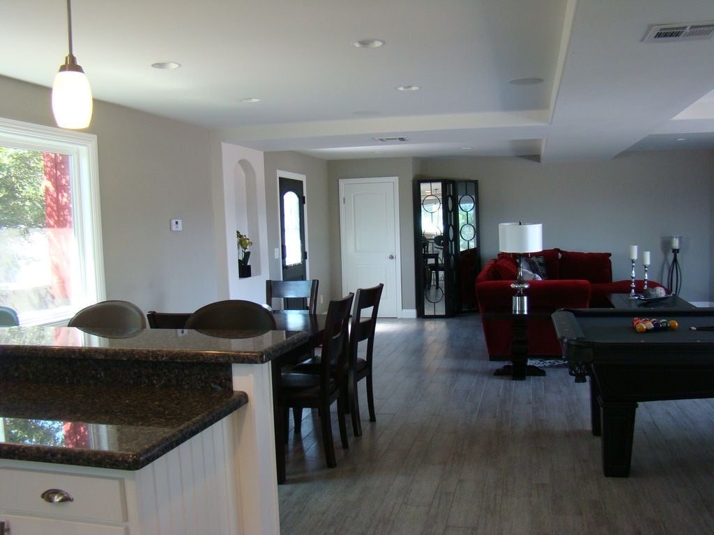 Dieses private, einstöckige Haus ist eine stilvoll eingerichtete Lagunenoase im Resort-Stil für deinen nächsten Urlaub im Herzen des Temecula Wine Country. Der Südpazifik ruft! Entspanne dich unter tahitianischen Palapas in diesem tropischen Hinterhof und kühle dich im umlaufenden Salzwasserpool mit plätschernden Wasserfällen und beruhigendem Spa/Whirlpool ab. Genieße das Grillen am Nachmittag auf dem Grill im Freien, während du deine Lieblings-Tiki-Getränke probierst.