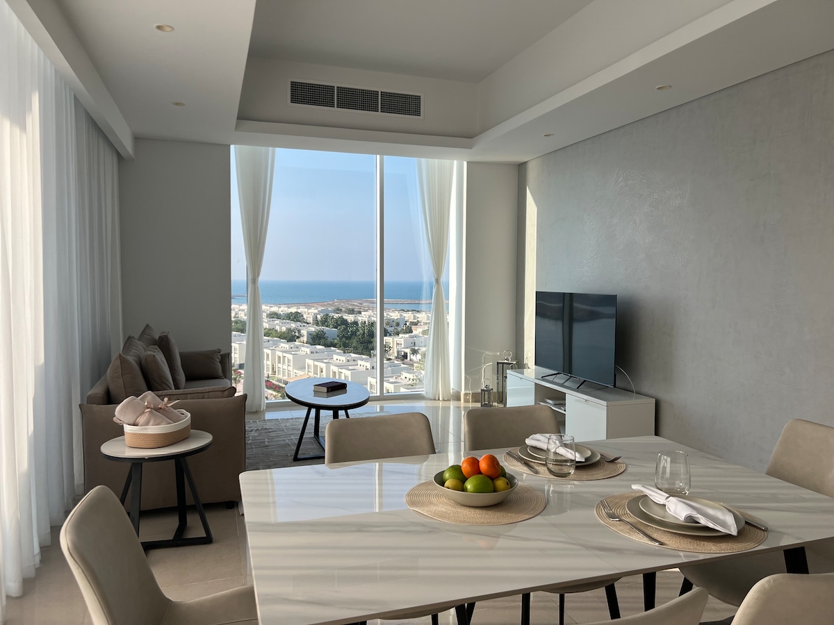 Komplett renovierte Einzimmer-Suite nur wenige Schritte vom kostenlosen Strand, Golfplatz, Yachthafen und in der Nähe der Luxushotels Ritz Carlton, Waldorf, Hilton. 20 m Fahrt zum Hajar-Gebirge. 24 Stunden Concierge/Schließfachzugang. Kostenloser Parkplatz. Kostenlos: Fitnessraum, Pool, Kinderbecken und 2 Kinderspielplätze. Wunderschöne große Terrasse mit Lounge-Sitzgelegenheiten und vollem Meerblick. Schlafen: 1 Kingsize-Bett + 2 Schlafsofas. Küche: Herd, Geschirrspüler, Kühlschrank, Nespresso, Toaster. Sonstiges: WLAN, 55-Zoll-Smart-TV, Netflix, Strandtücher, Sonnenschirm