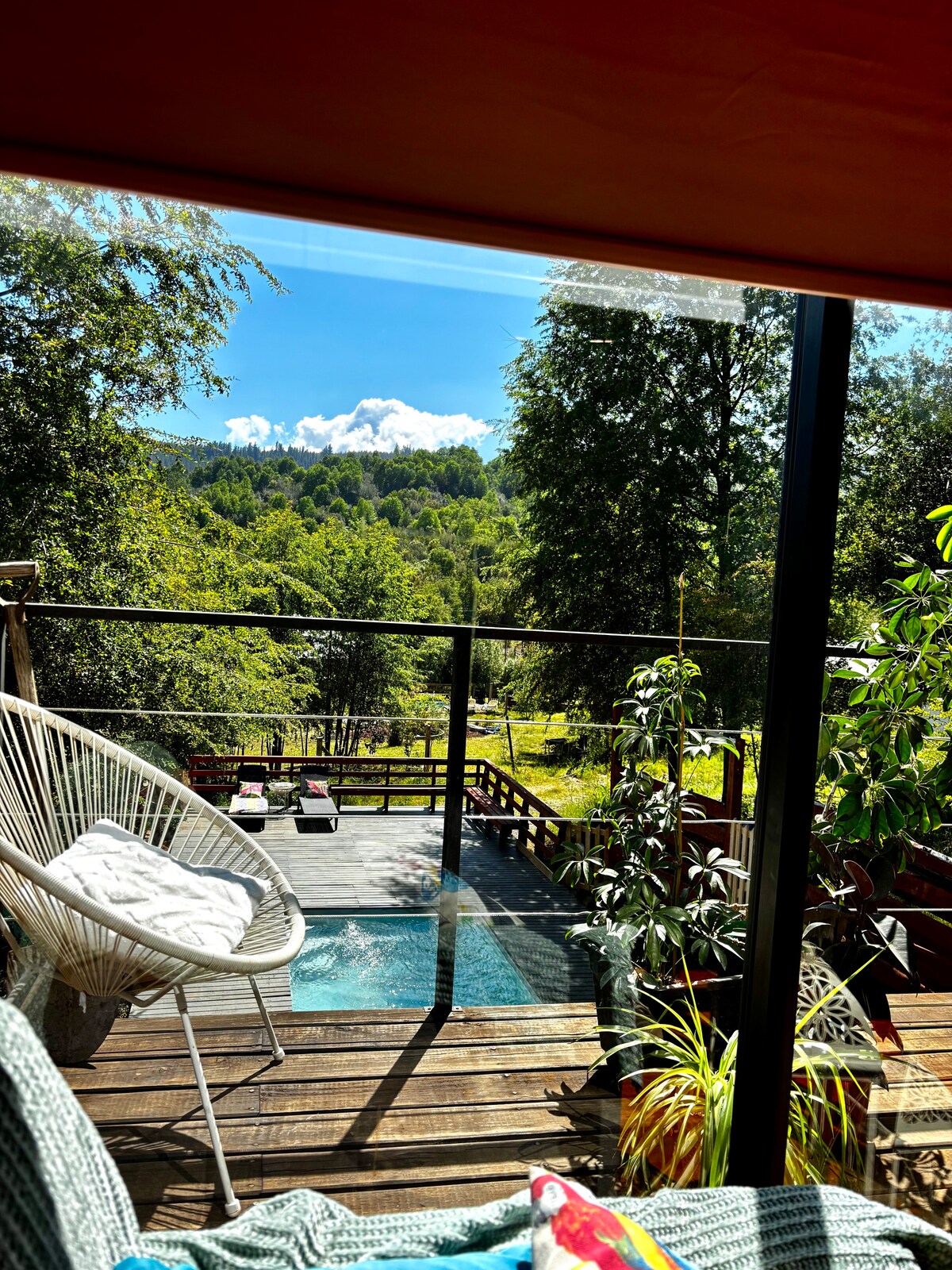 Estamos ubicados después del retén de carabineros, si , te ahorrarás el famoso taco que se forma en invierno. Ven y descansa en medio del bosque nativo con acceso directo a circuitos de treking, cascadas, flora y fauna. El departamento tiene 40 metros cuadrados más terraza. Este cuentan con una cama King (180x200), baño, chiflonera o acceso ( donde dejar todo tu equipo de ski ), cocina más una mesa comedor y un espacio con dos poltronas frente a un gran ventanal para disfrutar de las vistas.