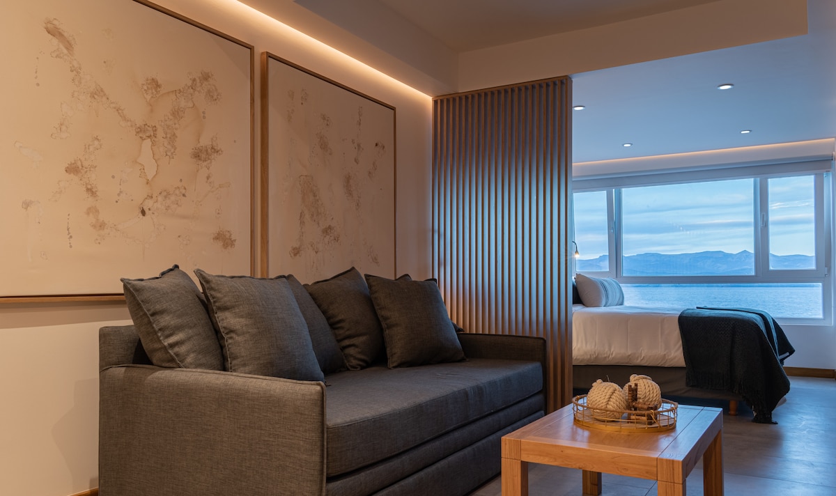 Diese luxuriöse Dachgeschosswohnung liegt direkt am See und bietet alles: einen weiten, ungehinderten 360°-Blick auf den See und die Berge, zwei separate Balkone, direkten Zugang zum Seeufer und schnelles WLAN. Obwohl sie nur wenige Gehminuten vom Zentrum entfernt und günstig an der Hauptstraße am See gelegen ist, ist die Wohnung ruhig, friedlich und völlig abgeschieden. Die Gäste werden eingeladen, die Aussicht durch das riesige dreifache Fenster zu genießen, während die Sonne über der patagonischen Steppe aufgeht und über den Anden untergeht.