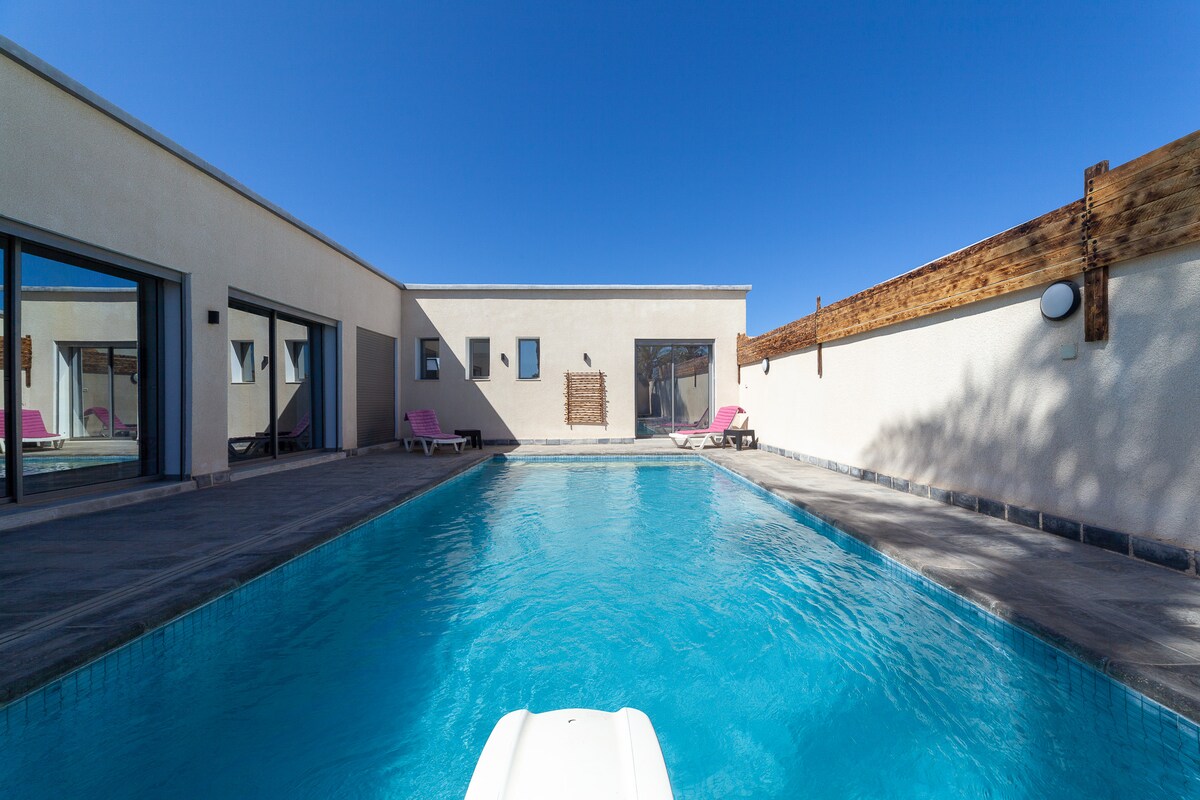 Willkommen in unserer Villa ohne Gegenüber nach Süden, in ruhiger Lage Sie verfügt über einen großen privaten Pool, ein Planschbecken, ein großes Wohnzimmer, eine ausgestattete Küche, eine Pergola-Ecke für Momente der Entspannung, einen Grill, eine gemütliche Ecke... Gesellschaftsspiele stehen zur Unterhaltung zur Verfügung 200 m von der Moschee entfernt, und mit dem Auto: 2 Minuten vom Supermarkt, 5 Minuten vom Strand und 15 Minuten vom Stadtzentrum von Midoun und Bourgo Mall entfernt Auto ist sehr zu empfehlen