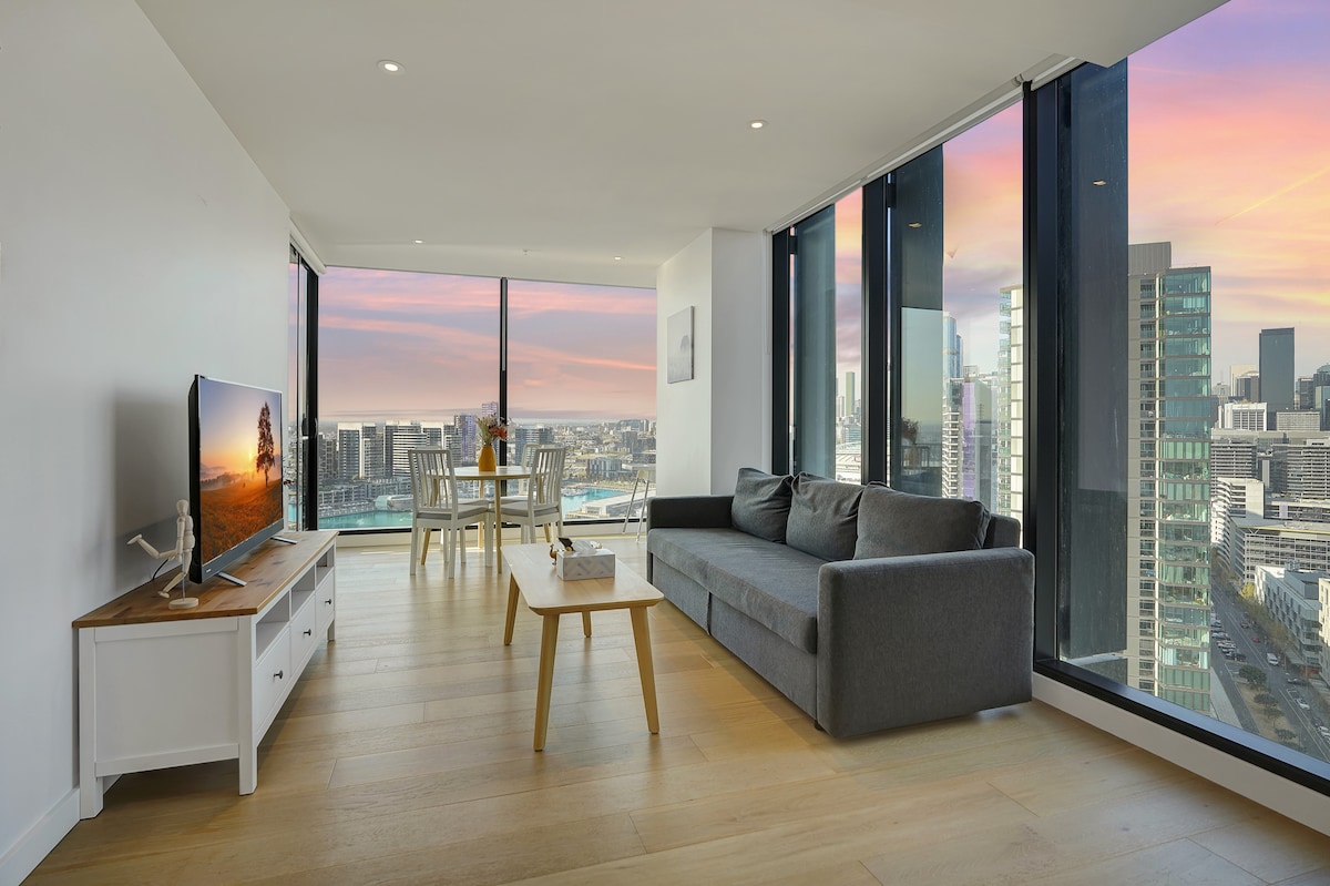 Dieses Apartment befindet sich auf der 28. Etage des Marina Tower und bietet eine Mischung aus Stil, Komfort und Panoramablick! Da du nur wenige Gehminuten vom Stadtteil Docklands, von Restaurants am Wasser und von den kostenlosen City-Loop-Straßenbahnen entfernt bist, befindest du dich in perfekter Lage. Die Wohnung ist sehr geräumig und bietet Platz für bis zu 5 Erwachsene (Ausziehbett auf vorherige Anfrage verfügbar). Sie haben exklusiven Zugang zu erstklassigen Einrichtungen – beheiztem Außenpool, Spa, Fitnessstudio, Lounge, Bibliothek und Unterhaltungsbereichen im Freien.
