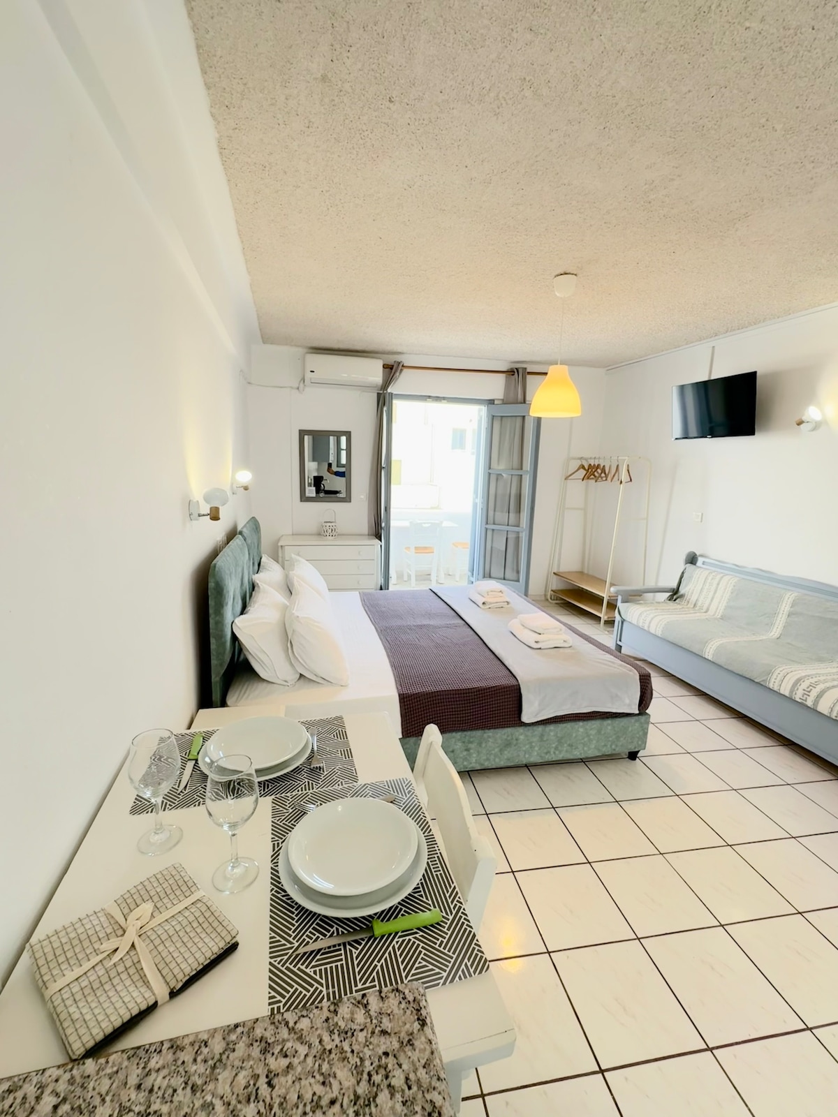 Das einladende und komfortable Studio ist 25 m² groß und verfügt über 4 Einzelbetten, eine Küchenzeile und ein privates Badezimmer. Es ist mit allem ausgestattet, was du für einen erholsamen und sicheren Urlaub benötigst. Das Studio ist für den privaten Gebrauch (nicht mit anderen Gästen geteilt). Der Strand von Kamari und die Bushaltestelle sind nur 2 Minuten entfernt. Einer der Hauptvorteile ist die Lage, die einen einfachen Zugang zu Geschäften, Restaurants und einem 24-Stunden-Markt bietet. Es ist gut mit dem Bus mit der Stadt Fira und dem Rest der Insel verbunden.
