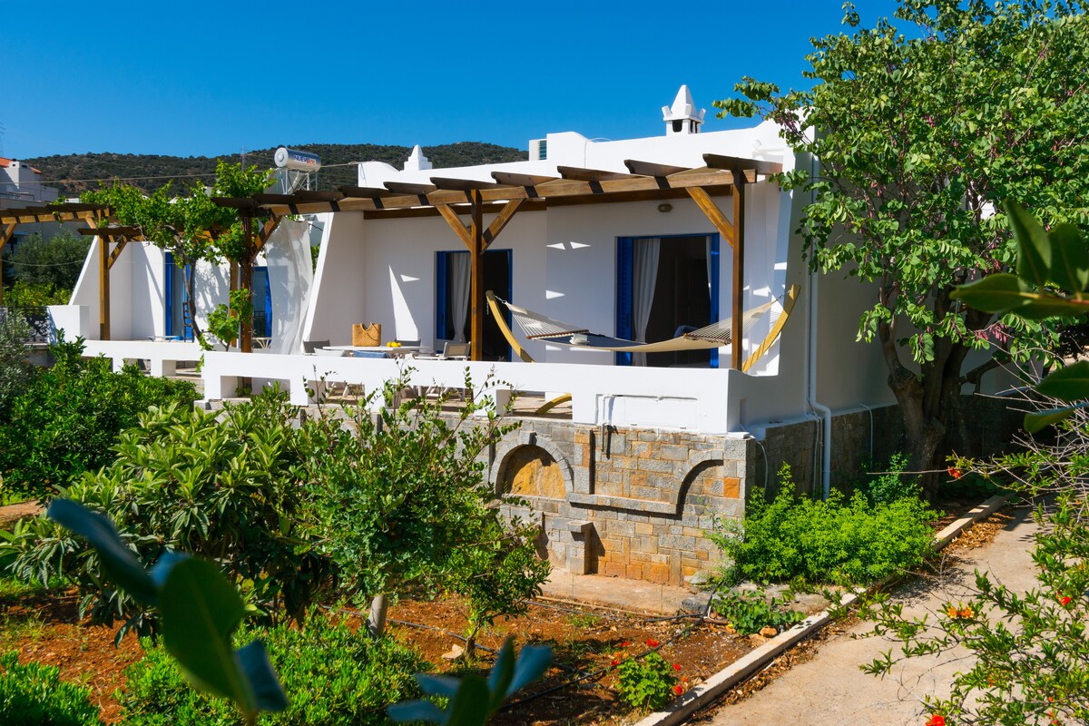 Ein idealer Ort für Personen, die Ruhe und Frieden in der Nähe der Natur suchen, und für Abenteurer, die Mittel- und Ostkreta erkunden möchten. Die Villa erstreckt sich über 95 Quadratmeter und befindet sich neben dem Sandstrand von Ammoudara (400 m). Die Stadt Agios Nikolaos liegt 5 Autominuten entfernt. Sie eignet sich für Paare und Gruppen von Einzelpersonen und bietet einen schönen Meerblick auf den Golf von Mirabello. Sie befindet sich in einem Garten voller Zitronenbäume und Olivenhaine mit Blick auf das große Blau.