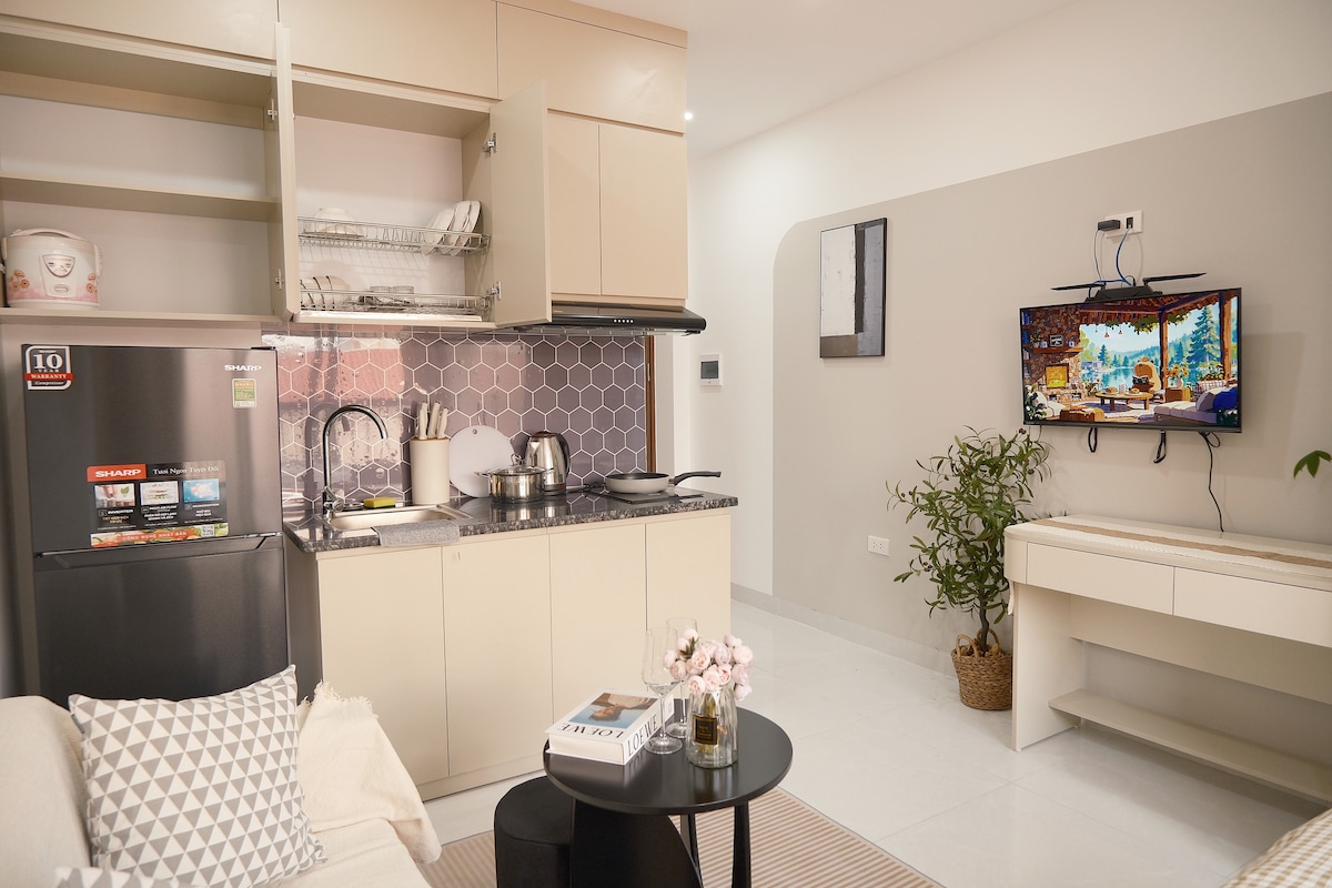 Bleiben Sie 3 Nächte kostenlos 1 Weg Flughafen. Kontaktiere uns direkt für Transportvereinbarungen. Ruhiger, lichtdurchfluteter Raum mit Panoramablick auf die Stadt. Es bietet einen atemberaubenden Blick auf die Skyline der Stadt, der Konzentration und Reflexion fördert – perfekt für ambitionierte Berufstätige, die eine stilvolle, übersichtliche Oase inmitten des urbanen Pulses suchen. Dieser durchdacht gestaltete Rückzugsort mit zwei Schlafzimmern fühlt sich wie ein privates Refugium an und verbindet moderne Hanoi-Energie mit zeitloser Ruhe. Dein erhöhter Ausgangspunkt für sinnvolle Arbeit und ruhige Erholung.