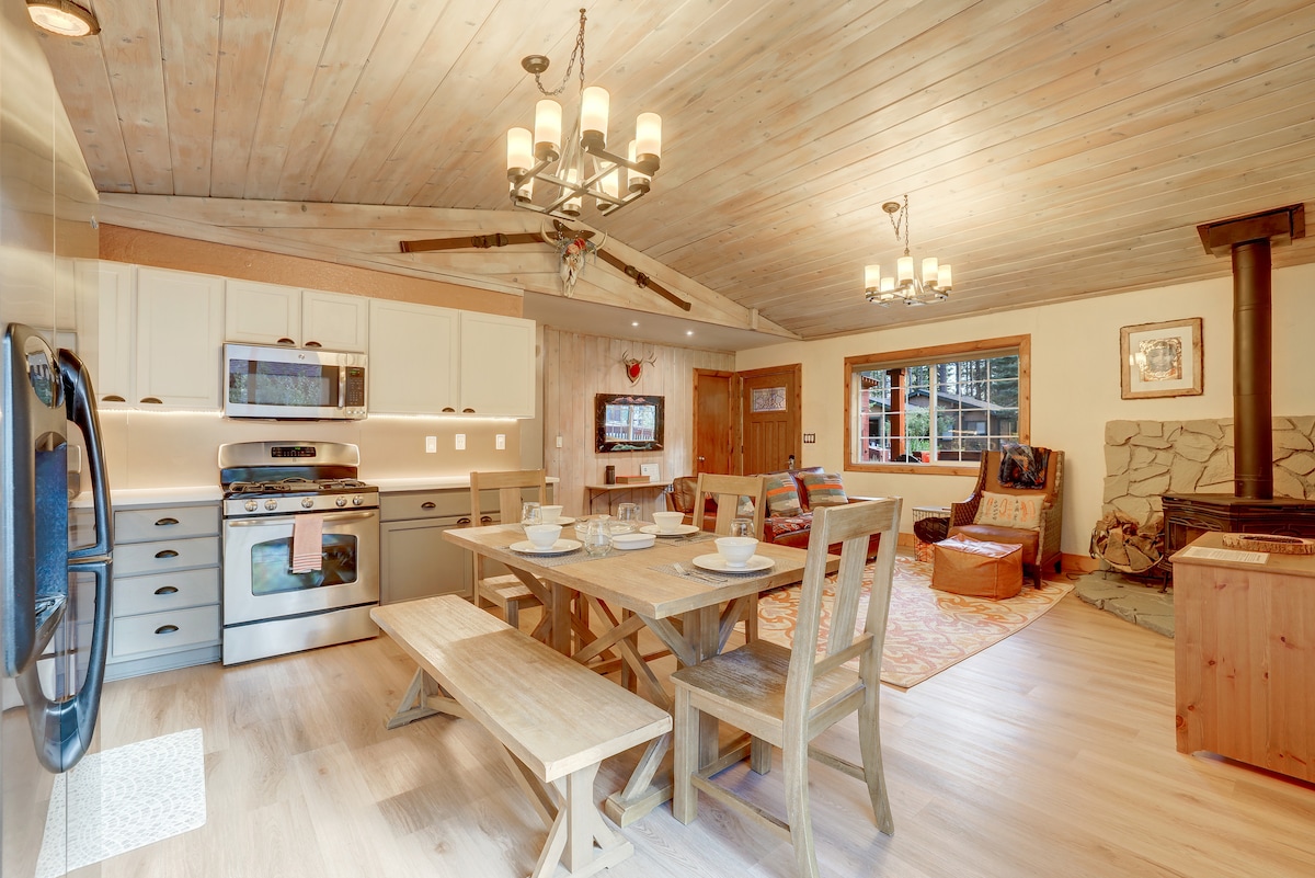 Schöne 3-Zimmer-Hütte mit privater Terrasse Truckee 8 Gäste 3 Schlafzimmer 6 Betten 2 Badezimmer Diese schöne 3BR/2BA-Hütte liegt nur 15 Minuten vom Stadtzentrum von Truckee entfernt und bietet den perfekten Tahoe-Kurzurlaub. Wärme dich am Holzkamin auf, entspanne auf der geräumigen Terrasse oder spiele eine Runde Tischfußball im Loft. 8 Schlafplätze. ÜBERSICHT ZUR IMMOBILIE Ein offener Grundriss mit gewölbten Decken, Parkettböden und modernem Bergdekor schafft eine einladende Atmosphäre mit einer Fülle von Innen- und Außenbereichen.