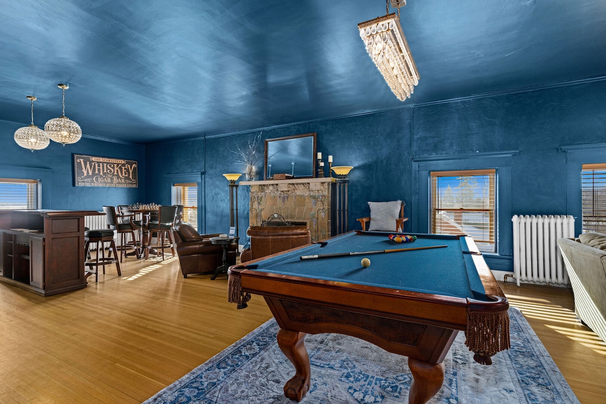 Indulge in the ultimate relaxation in the Billiards Suite, a luxurious 1,100 sqft 2-bedroom retreat that captures the essence of lounge-inspired living. Each bedroom offers the comfort of a king-sized bed, while the living area boasts a large sectional couch, perfect for lounging in front of the massive 85-inch TV. Warm up by the fireplace or whip up a gourmet meal in the full chefs kitchen; this suite is designed to cater to every whim.