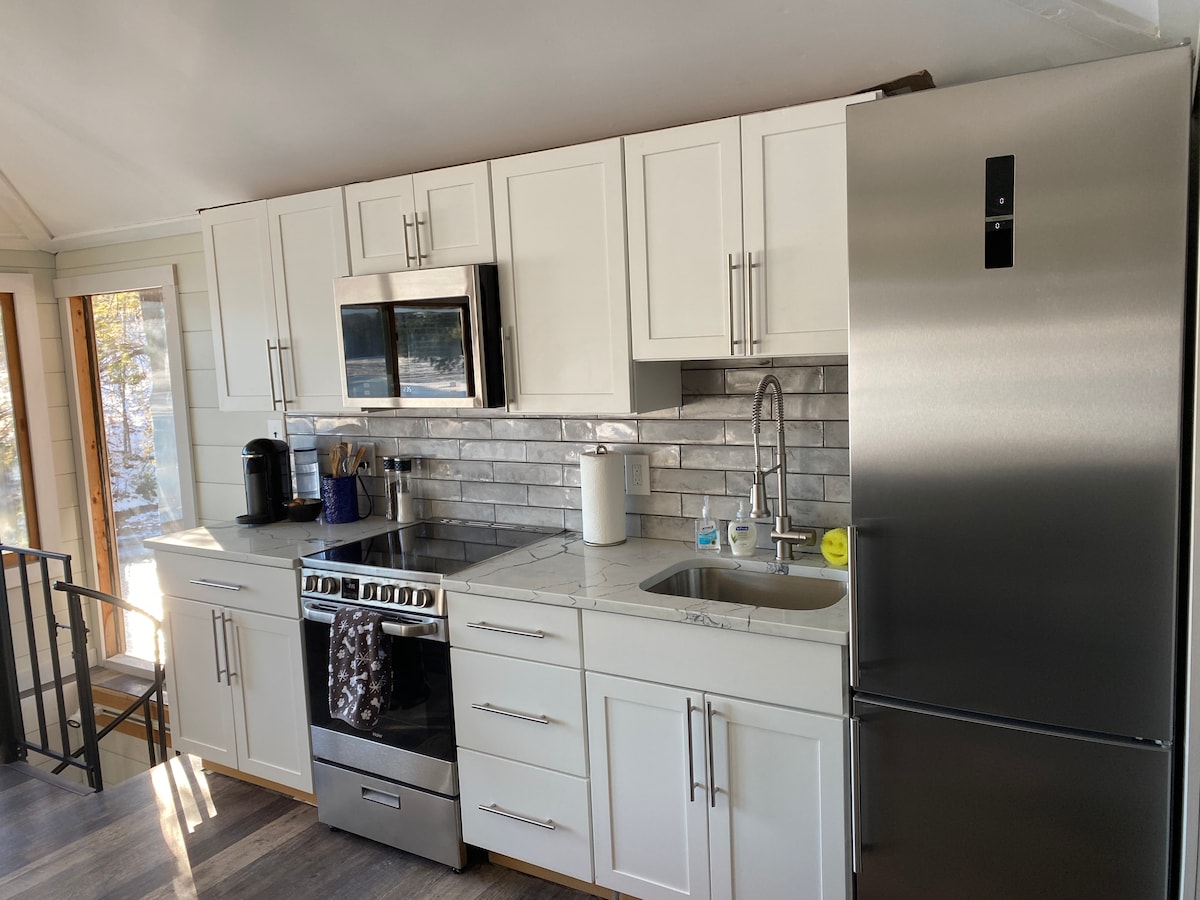 Entfliehe in ein traumhaftes Holzrahmen-Cottage in den Wäldern von Maine! Hoch aufragende Balken, Fußbodenheizung, ein Kingsize-Hochbett und eine knisternde Feuerstelle erwarten dich. Trinke Kaffee auf einem der beiden Decks, wandere auf dem Bradbury Mountain (3 Minuten entfernt), kaufe in Freeport (10 Minuten entfernt) ein oder speise in Portland (20 Minuten entfernt) – und kehre dann in dein gemütliches Versteck unter den Sternen zurück. Voll ausgestattete Küche, gewölbte Decken, strahlende Wärmeböden, private Einfahrt, Feuerstelle und ruhiger Waldblick machen es zum perfekten Rückzugsort das ganze Jahr über.