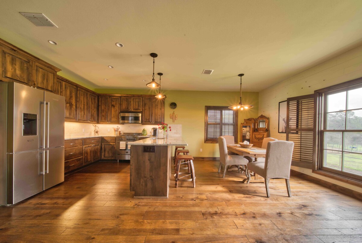 Schönes, rustikales Haus im „Hill-Country-Modern“-Stil auf fünf Hektar Land mit Blick auf unseren saisonalen Teich und das Tal. Meine Unterkunft bietet die Nutzung von Wohnraum im Freien wie keine andere. Die Terrasse und der überdachte Durchgang sind integrale Bestandteile des nutzbaren Raums. Auf der einen Seite des Sunrise House befindet sich ein großes Wohnzimmer mit einem Kamin und riesigen Fenstern. Das Haus verfügt über erstklassige Armaturen und Oberflächen, eine Mischung aus neuen und ausgewählten Möbeln und Einrichtungsgegenständen sowie schöne, maßgefertigte Kunstwerke.