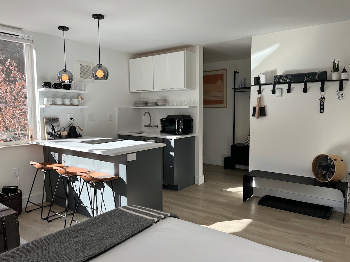 Willkommen im neu renovierten SQRL-Nest. Unser gemütlicher Rückzugsort ist der perfekte Ort, um sich zu entspannen und die atemberaubende Umgebung zu genießen. Wunderschön gestalteter, moderner Raum mit einem 9' großen Fenster mit Bergblick, einem Queensize-Bett und einer Doppelschlafcouch. Unsere Küchenzeile ist mit einem Minikühlschrank, einem Getränkekühlschrank, einer 3-in-1-Mikrowelle, einem Umluftofen, einer Heißluftfritteuse und einer Kaffeemaschine ausgestattet. Perfekt für die Zubereitung schneller Mahlzeiten oder einen Snack. Das Spa-Badezimmer bietet flauschige Handtücher, Bademäntel und luxuriöse Annehmlichkeiten. BL #46.