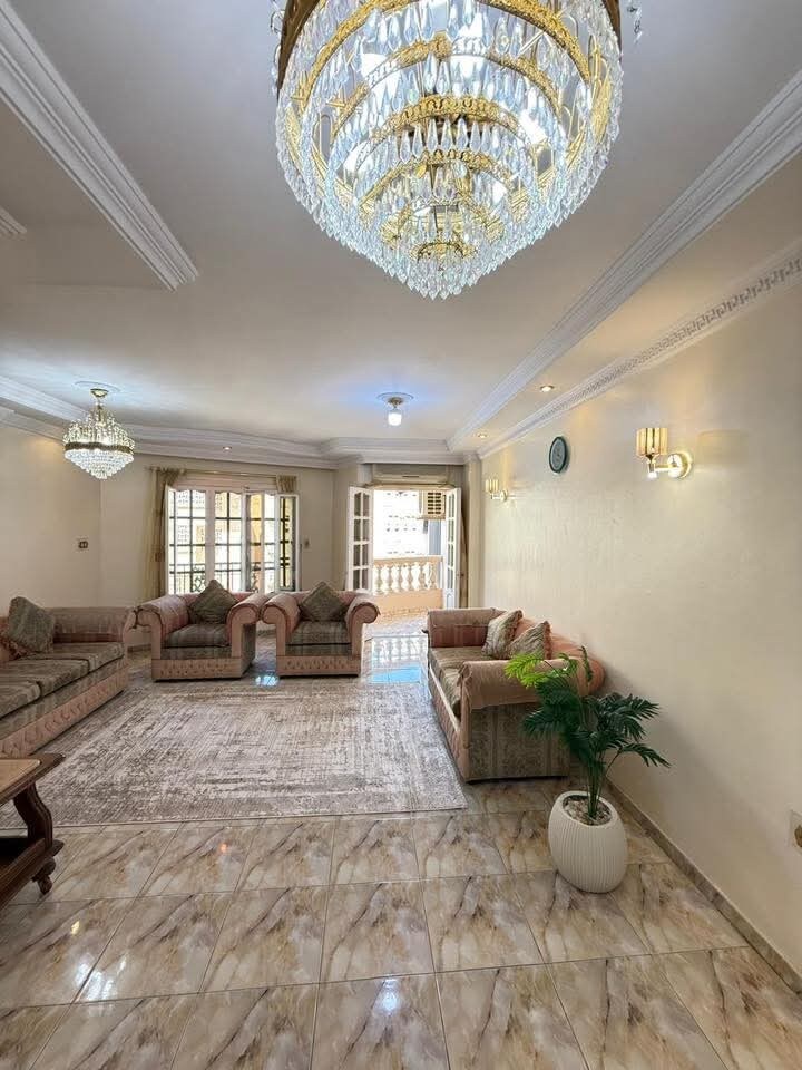 شقة مفروشة سوبر لوكس للإيجار اليومي مساحة 185 متر بها غرفة نوم كاملة وبها تكييف وغرفة أطفال بها ٣سراير وسرير بيبي وغرفة ليفينج بها شاشة وبلكونة وأتنين حمام وريسيبشن كبير به صالون وأنترية وسفرة وركنة ومكتبة ومطبخ مجهز بالكامل وبه جميع الأجهزة الكهربائية