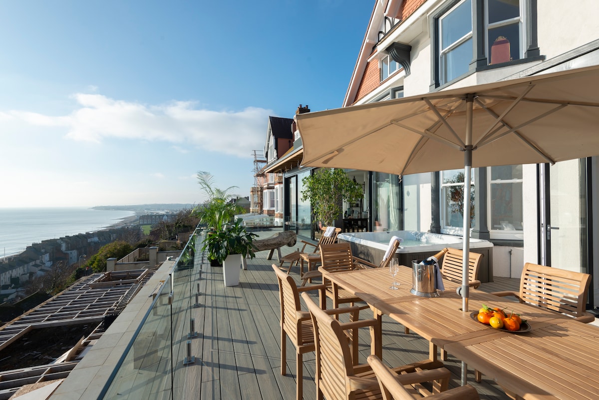 Cliffhanger is situated on the cliffs in the trendy St Leonards area of Hastings and boasts exceptional sea-views from all the major rooms. 6 bedrooms - 5 ensuite and 1 children's bunk bed room - comfortably sleeps 12 - 14 while the ground-floor offers excellent reception rooms with a cosy lounge, a well-equipped kitchen / diner, and a sun deck with BBQ, dining table & hot-tub. The top bedroom is more like a private family suite and has sliding doors opening onto its own roof terrace.