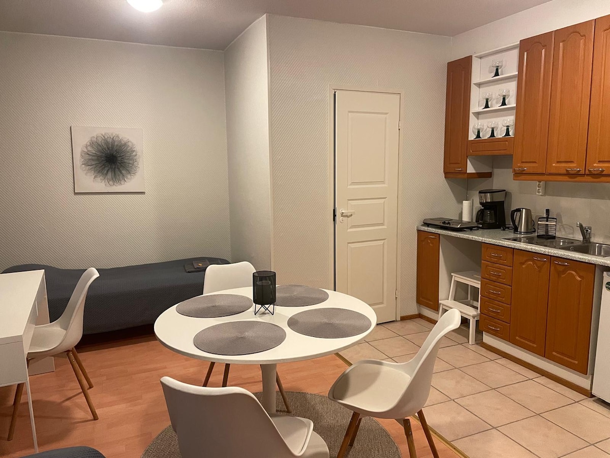Ruhige Einzimmerwohnung mit einer Sauna von ca. 50 m ² mit tollem Flussblick, neben dem Bahnhof, im Zentrum von Joensuu. Die Wohnung umfasst: - Kostenloses Parkhaus. - Luftwärmepumpe. -1000m Glasfaser-Internet - Voll ausgestattet für 4. - Brettspiele. Downtown Services innerhalb von 5 Minuten zu Fuß. Das Haus ist rauchfrei, Aufzug und Party ist verboten. Bleib bei uns wie ein Hotel und fühle dich wie zuhause. Unser Zuhause ist mit hochwertigen Produkten ausgestattet, darunter Familo-Kissen und ein großes Doppelbett auf Hotel-Niveau.