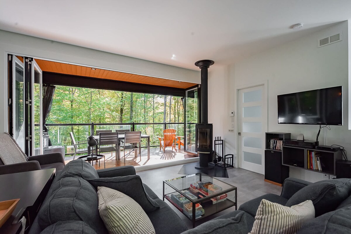 Monumental open concept, in the heart of nature. Access to trails directly behind the house. Wood stove, large modern bathroom, one bedroom + sofa bed. Another sofa bed in the living room. Ideal chalet for a couple with children or two couples. Wild birds, turkey, and deer lovers welcome! Wifi and EV charger included. Dogs Welcome! CITQ : #308038