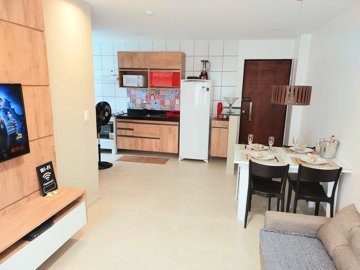 Apto com varanda . Ar condicionado no quarto com uma cama queen e na sala um sofá cama de tamanho casal normal, disponibilizamos apenas uma muda de roupa de cama e uma de toalhas independente da quantidade de dias da hospedagem, ventilador na sala, Cozinha equipada, geladeira, fogão, microondas, cafeteira, talheres, copos, pratos, xícaras, algumas panelas. Banheiro com chuveiro elétrico. Varanda e janelas não tem tela nem rede, cuidado com as crianças pequenas!. Todo o apto tem a voltagem 220v.
