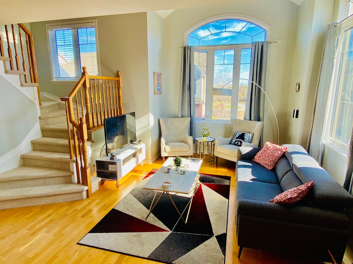 Willkommen in deinem zweiten Zuhause! Ein modernes 3-stöckiges Haus, das für deinen Komfort und deine Bequemlichkeit entworfen wurde, perfekt für Urlaub, Familien oder Geschäftsreisende 📍 Standort-Highlights: • 15 Minuten Fahrtzeit in die Innenstadt von Ottawa • Mehrere Parks innerhalb von 5 Gehminuten (mit Tennis- und Pickleball-Plätzen) • NCC-Naturpfade in der Nähe zum Wandern und Radfahren • Bushaltestelle innerhalb von 5 Gehminuten • Nur wenige Minuten vom Highway 417 entfernt • In der Nähe der Einkaufszentren St-Laurent & Rideau, des Ottawa River, des Montfort Hospital und des Parliament Hill