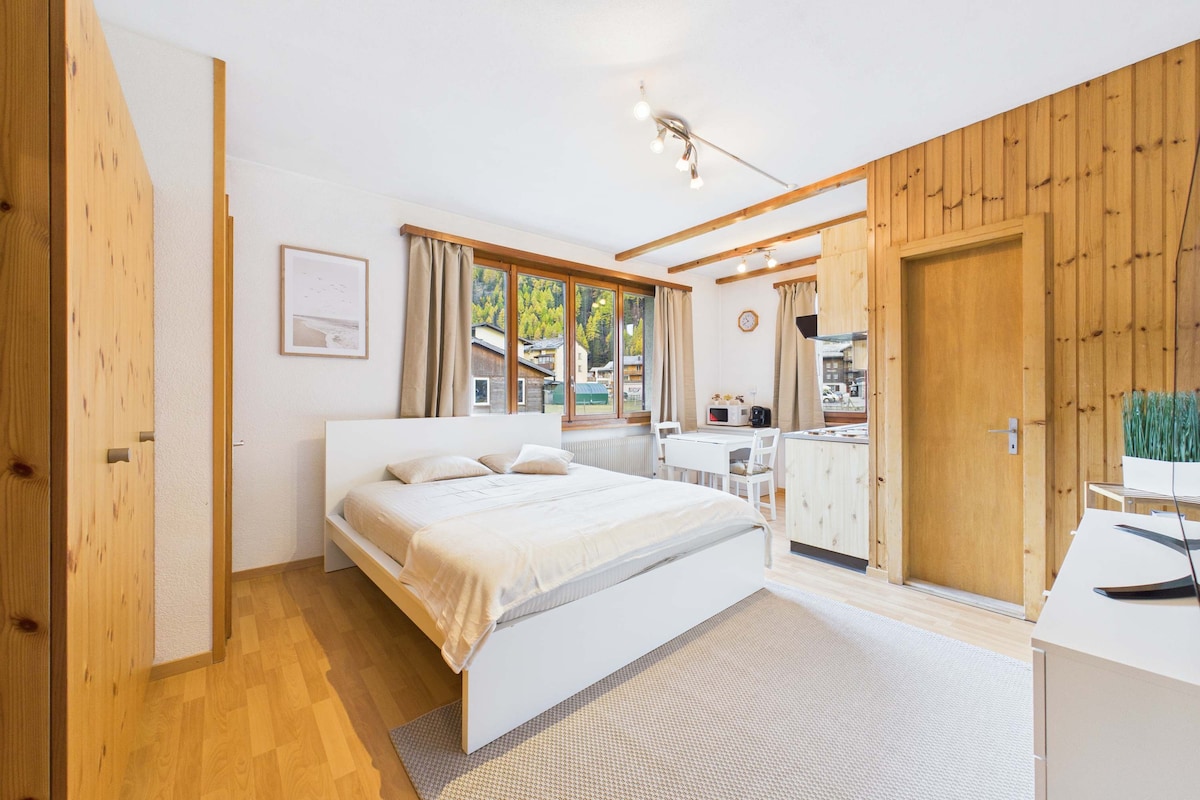 Nur 10 Gehminuten vom Parkplatz entfernt findest du das Studio Juwel am sonnigen Ende der Lomattenstrasse. Vor dem Haus gibt es eine Bushaltestelle, die dich im Winter zu den Skilifts bringt. Nicht einmal 50 m entfernt ist der nächste Supermarkt. Im Studio findest du alles, was du brauchst: Bad, voll ausgestattete Küche mit Kühlschrank, Backofen und Geschirrspüler. Kleines Doppelbett, entspannende Stühle, ausziehbarer Esstisch, TV, Balkon mit etwas Bergblick und viel Nachmittagssonne!