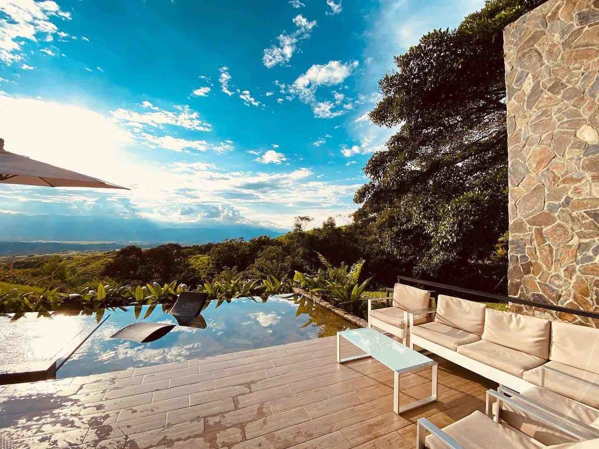Country House in Pereira, Sector Cerritos, Easy Access. You will enjoy sunny days, tranquility, connection with Nature, and beautiful sunsets. Overlooking a spectacular guadual. Located 15 minutes from the International Matecaña Airport, with an excellent location to places of interest in the Coffee Region; 5 minutes from the best food malls in the city, supermarkets. Perfect place to enjoy with the family. With heated Jacuzzi, BBQ area, wood oven for pizza. Campfire area. Pet Friendly.
