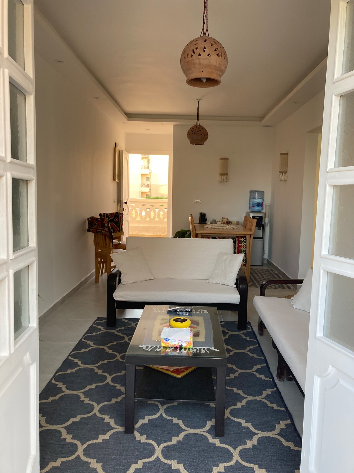 Entspanne dich mit der ganzen Familie oder Freunden in dieser friedlichen Unterkunft, schöne Erdgeschosswohnung mit Garten. Viele Restaurants und Supermärkte sind in der Nähe, Tolip und Zahran Markt 5 Minuten entfernt, New Alameen ist 15 Minuten, Hammam Stadt ist 15 Minuten.
