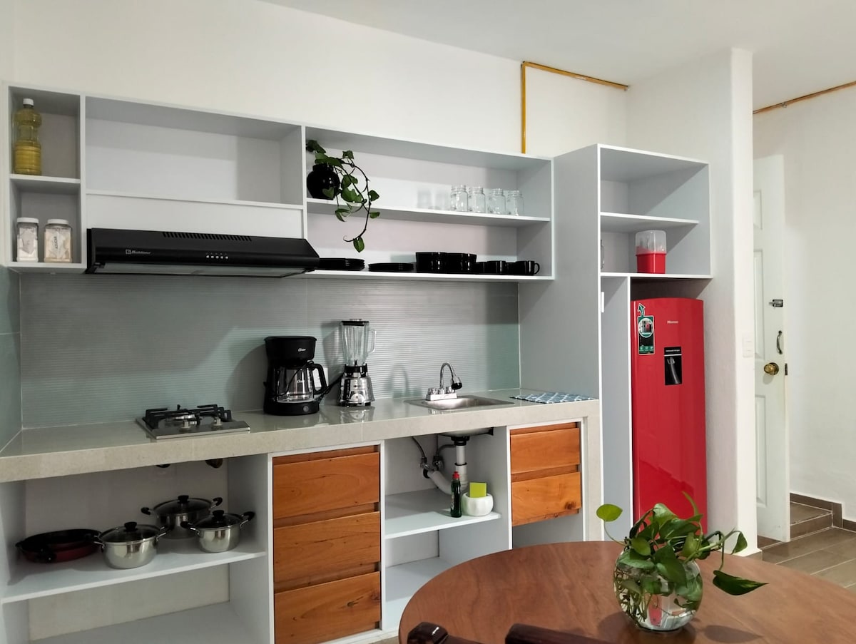 Cozumel es ideal para dos personas que buscan tranquilidad, privacidad y ubicación inmejorable en la cuidad. Iluminación cálida y decoración acogedora, pensado para que descanses cómodamente en su cama matrimonial mientras disfrutas de tus series favoritas en Netflix. Cuenta con baño privado con agua caliente y una cocina equipada con lo básico para que prepares tus alimentos con facilidad. Aunque no tiene ventanas, su ambiente invita a la relajación y al descanso total durante tu estancia.
