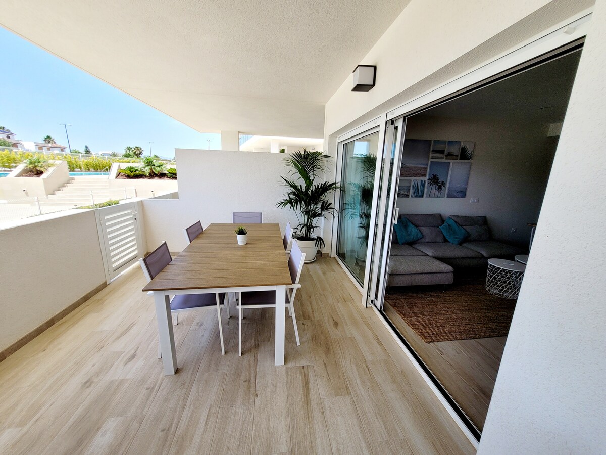 Genieße deinen Urlaub in dieser schönen Wohnung in bester Lage, neben dem Strand und allen Annehmlichkeiten. (Supermarkt Verbrauch, Restaurants, Läden, Wasserpark..) Kapazität 4 Personen, sehr großes Schlafzimmer mit Doppelbett und hochwertigem Cheslong-Sofa im Wohnzimmer. Inklusive Bettwäsche und Handtücher. Klimaanlage mit Leitung und Deckenventilatoren. Wifi und TV 55". Voll ausgestattete Küche, Waschmaschine,Geschirrspüler,Kaffeemaschinen.. 24 m ² Terrasse mit herrlichem Blick.
