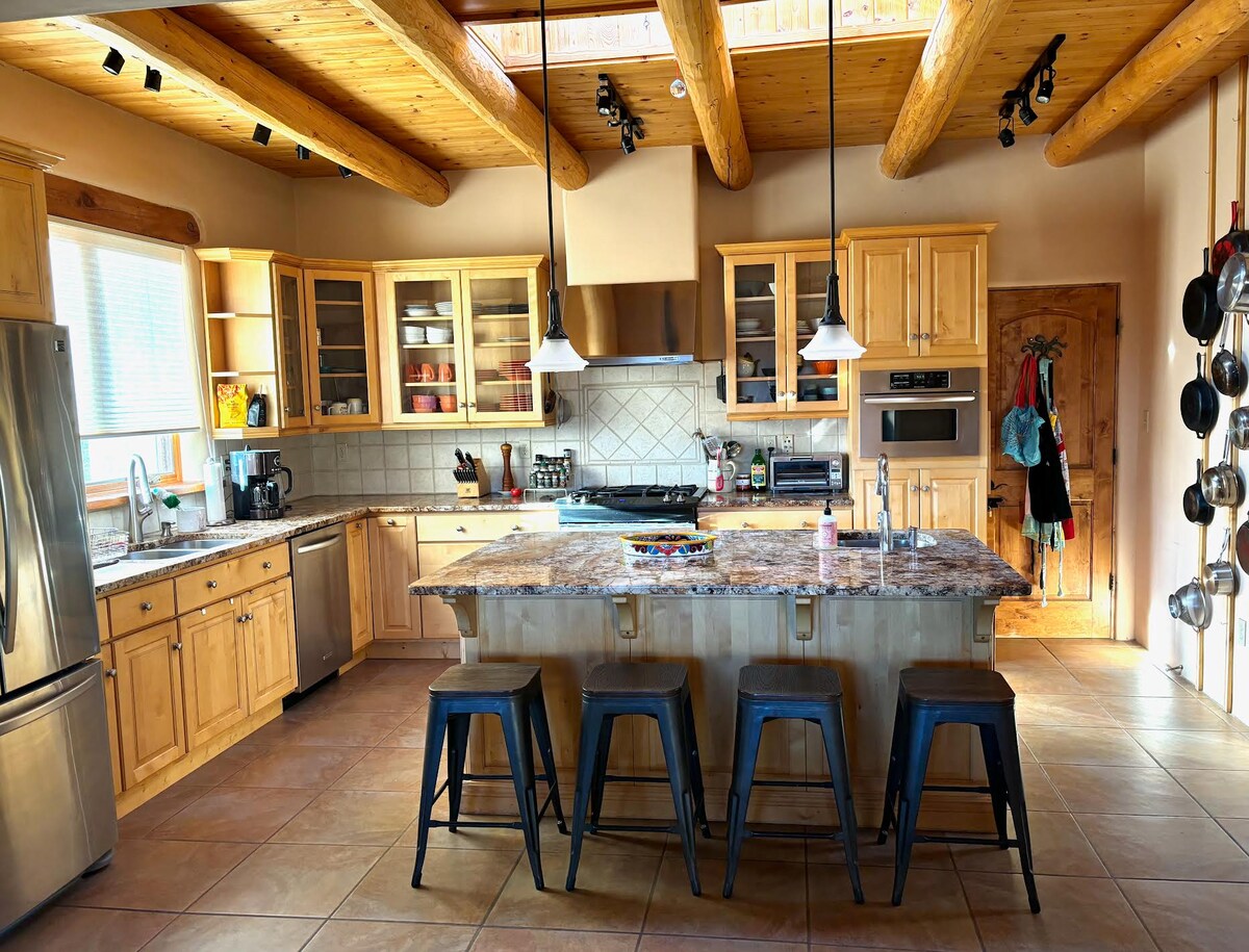 Unser modernes Erdhaus ist ein gemütliches, von Handwerkern gebautes Nest, das seine Besucher mit Licht, offenem Raum und Farbe verwöhnt. Es hat eine ruhige, private Umgebung mit allem, was du benötigst, um deinen Aufenthalt komfortabel und hoffentlich inspiriert zu machen. Die Natur ist die andere Hälfte dieses Hauses und schafft ein umhüllendes Amphitheater aus Gärten, Vögeln, Bäumen und einer Hängematte. Jenseits dieses privaten Nestes befinden sich ein 360-Grad-Blick auf die Sangre de Christo Mountains, die Rio Grande Gorge, spektakuläre Sonnenuntergänge und kilometerlange Wander- und Radwege.