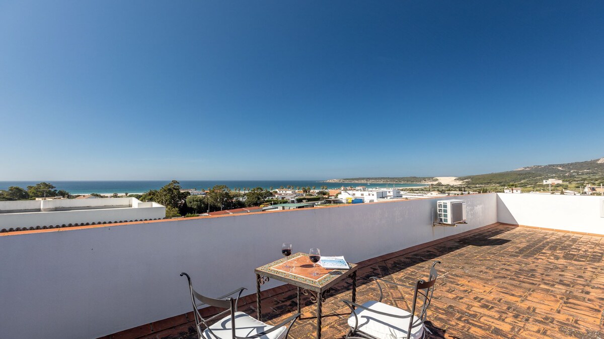 Unique 3 bedroom beach house apartment with private terrace and direct access to an almost deserted beach For up to 4persons Luxury interior Cool summer breeze on the outside covered terrace with stunning view over the street of Gibraltar A memorable holiday listening to the waves gently breaking on the sea shore Stunning sea view with Marocco just 12km away on the horizon Situated just 15min drive from Tarifa 2 restaurants within walking distance The villa contains 2 apartments
