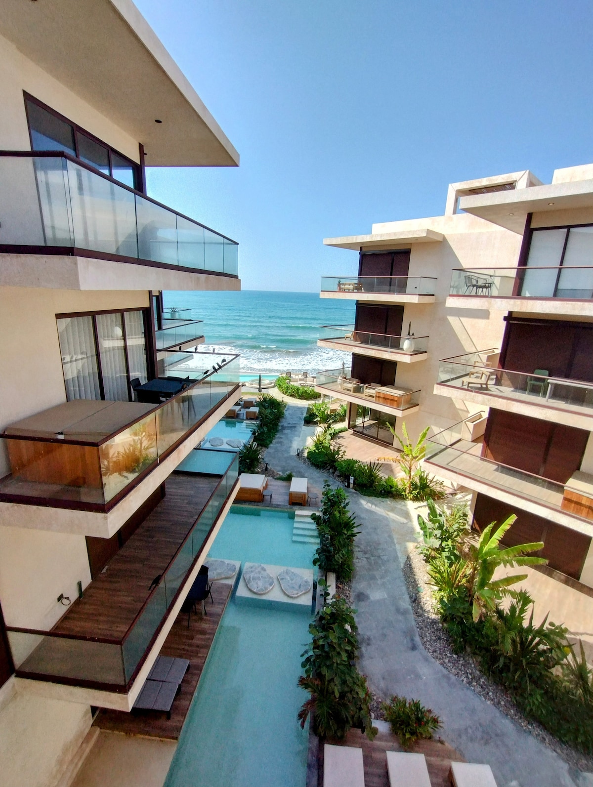 Penthouse Aldea Ananta: Luxus „Tulum-Stil“ in Mazatlan / Direkter Strandzugang „Während der Hochzeitssaison“ ist dieser Raum aufgrund seiner Nähe zu den Veranstaltungsräumen ideal: **Bahía Delfín, **Tolle Marina, Erlebe magische Sonnenuntergänge von deinem privaten Dachgarten mit Grill und Whirlpool. Genieße auch den Zickzack-Pool, den Infinity-Pool, spiele Paddle-Tennis von oben und trainiere im Fitnessraum. Perfekt für alle, die einen Kurzurlaub und Ruhe abseits des hektischen Treibens der Stadt suchen.