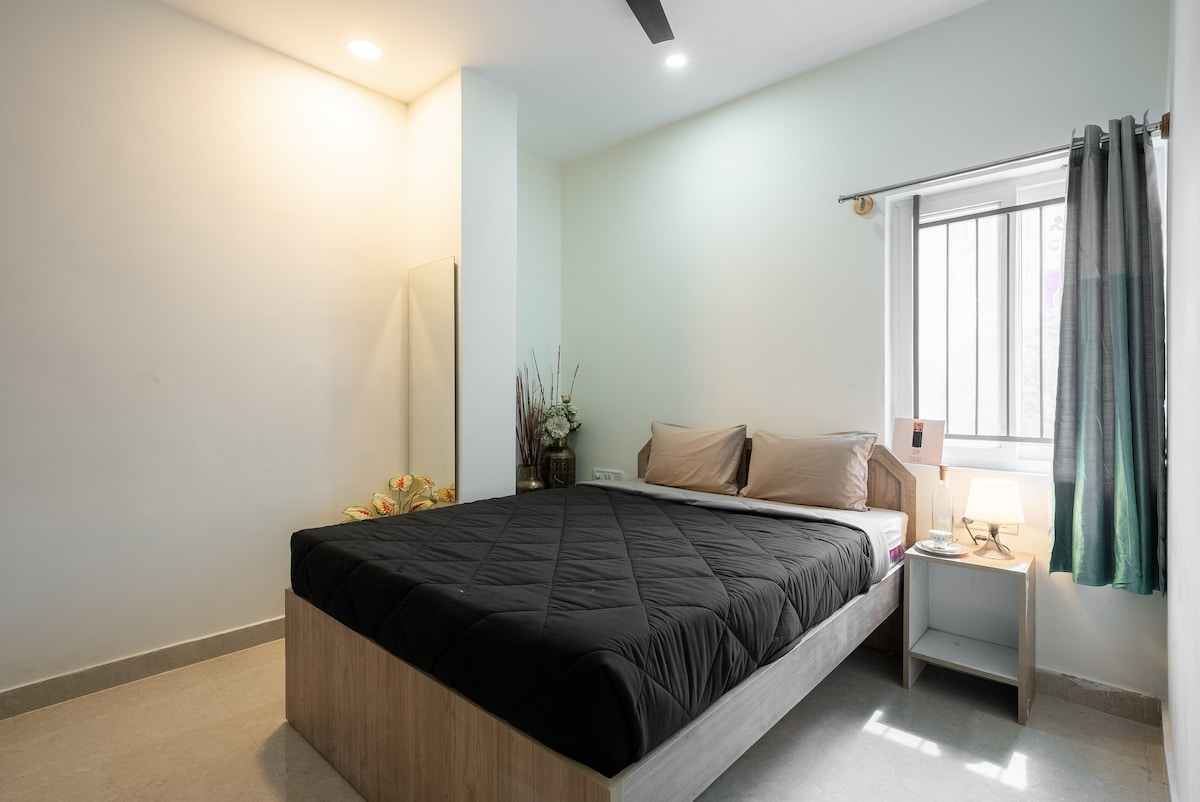 This classy Airbnb non-smoking room on the Ground floor is designed to offer a positive & calm vibe in this chaotic world. Each room has an attached washroom. KINDLY GO THROUGH ALL OF OUR LISTING PHOTOS BEFORE BOOKING. There's a common sit-out, community kitchen (with an electric induction stove for basic cooking) with a common refrigerator, washing machine & RO water purifier on the top floor. PS: This is NOT a 1BHK flat. These are 35 single rooms in a Building.