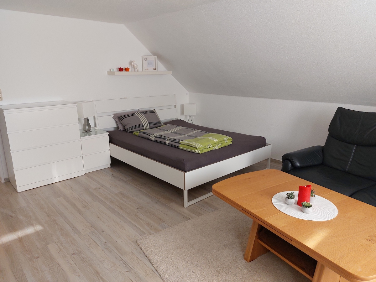 Möchtest du in tollem Ambiente mit Blick ins Grüne wohnen (oder arbeiten) und in 5 Min zu Fuß an der Uni/ in 10 Min mit dem Rad in der Stadt sein? Unsere helle und moderne Dachgeschosswohnung mit eigenem Eingang verfügt über eine Küche mit Kochgelegenheit, ein geräumiges Bad und einen großzügigen Ess-, Wohn- und Schlafbereich. Die Nähe zur Innenstadt (2,5km) lädt zu Kultur, Shopping und kulinarischem Genuss ein.