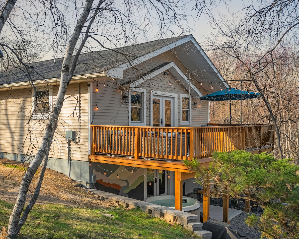 Taucht ein in die perfekte Mischung aus Gelassenheit und Romantik in unserem komplett renovierten Poconos-Blockhaus. Sie bietet ein privates Ambiente und befindet sich gleichzeitig in einer sicheren Gegend. Kuschelt euch in unser Wohnzimmer-Tagesbett und genießt den Blick auf den Hinterhofwald durch das riesige Panoramafenster. Entspanne dich im Whirlpool oder an der Feuerstelle, wo Erinnerungen gemacht werden! Zentral gelegen, bietet die Hütte Zugang zu Skigebieten und Wanderwegen. Als Gäste genießt du auch Zugang zum See, Pool und Sportplätzen.
