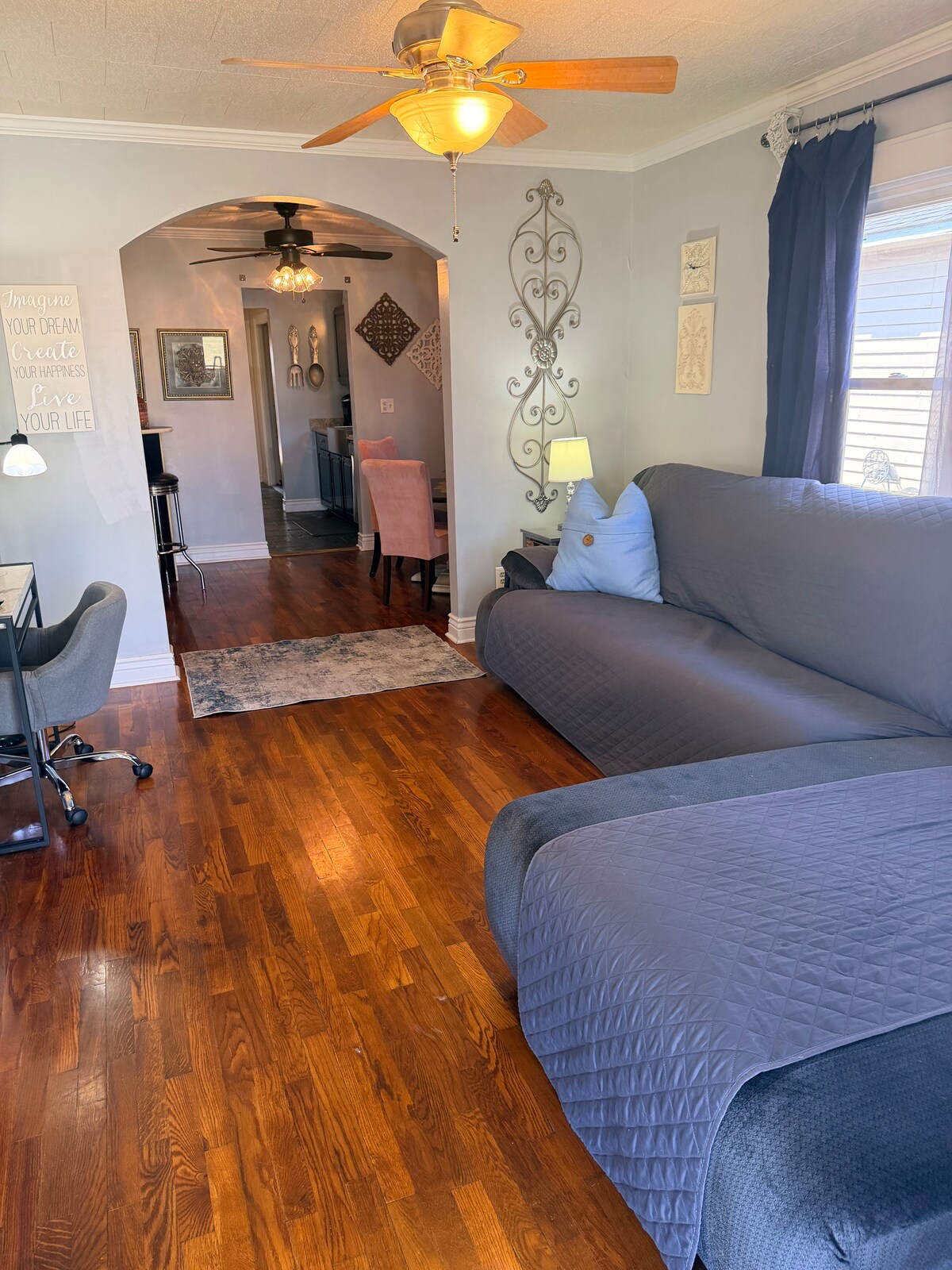 Dies ist eine Wohnung im „Friends“-Stil von der orangefarbenen Samt-Couch bis zur lila Tür! Die Böden sind aus dem ursprünglichen Hartholz und wurden neu lackiert. Das Wohnzimmer, die Küche und das Esszimmer sind offen gestaltet. Sie befindet sich im historischen Viertel von Enid, in der Nähe der Innenstadt und von Restaurants.
