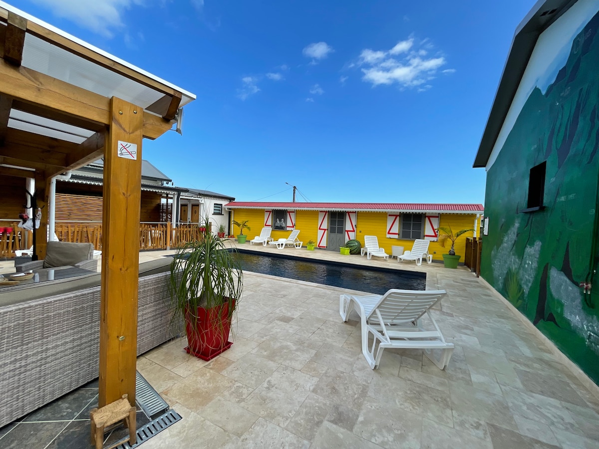 Machen Sie eine Pause und entspannen Sie sich in unserem Bungalow mit einem Schlafzimmer, einem Badezimmer und WC, einer überdachten und ausgestatteten Außenküche… Von der Terrasse aus haben Sie einen Blick auf die Berge und das Dorf! Sie können auch Wanderwege in der Nähe nehmen, um schöne Landschaften zu entdecken! Unser Dorf ist ein kleiner Pool mit schönen kreolischen Kästchen und schönen Gärten!