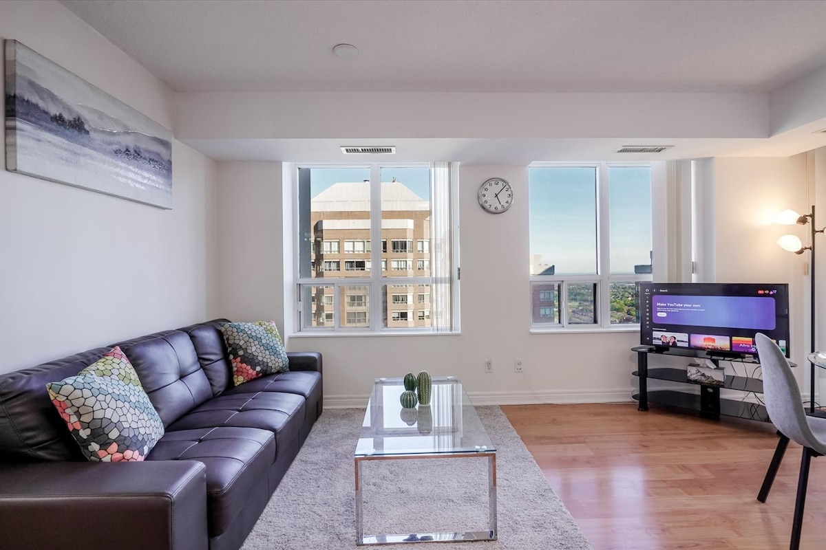 Willkommen in dieser modernen, anspruchsvollen und voll möblierten 1-Zimmer-Wohnung im Herzen von Mississauga's Square One District. Verfügt über 65-Zoll-Wohnzimmer-TV, Schlafzimmer-TV, voll ausgestattete Küche mit Kochgeschirr und Grundausstattung, Waschmaschine/Trockner und schnelles WLAN. Genieße die Annehmlichkeiten des Gebäudes wie einen Fitnessraum, einen sicheren Zugang mit Schlüsselanhänger, Parkplätze, ein Lebensmittelgeschäft vor Ort und die Nähe zu Restaurants und LCBO. Nur 15 Minuten zum Flughafen Pearson und 25 Minuten zu den Sehenswürdigkeiten in der Innenstadt von Toronto. Perfekt für ein Paar und kleine Gruppen.