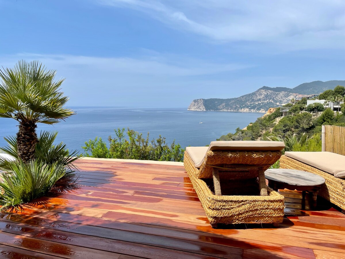 Willkommen in einem ruhigen Rückzugsort auf Ibiza, wo dezente Luxus und natürliche Schönheit zusammenkommen. Diese komplett renovierte Villa befindet sich auf einem 3.000 m ² großen Grundstück mit tropischen Gärten und ist für diejenigen konzipiert, die Privatsphäre und Ruhe suchen. Die Schlafzimmer mit jeweils eigenem Bad bieten eine ruhige Abgeschiedenheit, während die Terrassen einen atemberaubenden Blick auf das Meer und die Sonnenuntergänge bieten. Die von Bali inspirierten Innenräume schaffen durchgehend ein Gefühl der Ruhe, ergänzt durch den beheizten Swimmingpool, der mit Bali-Stein gesäumt ist.