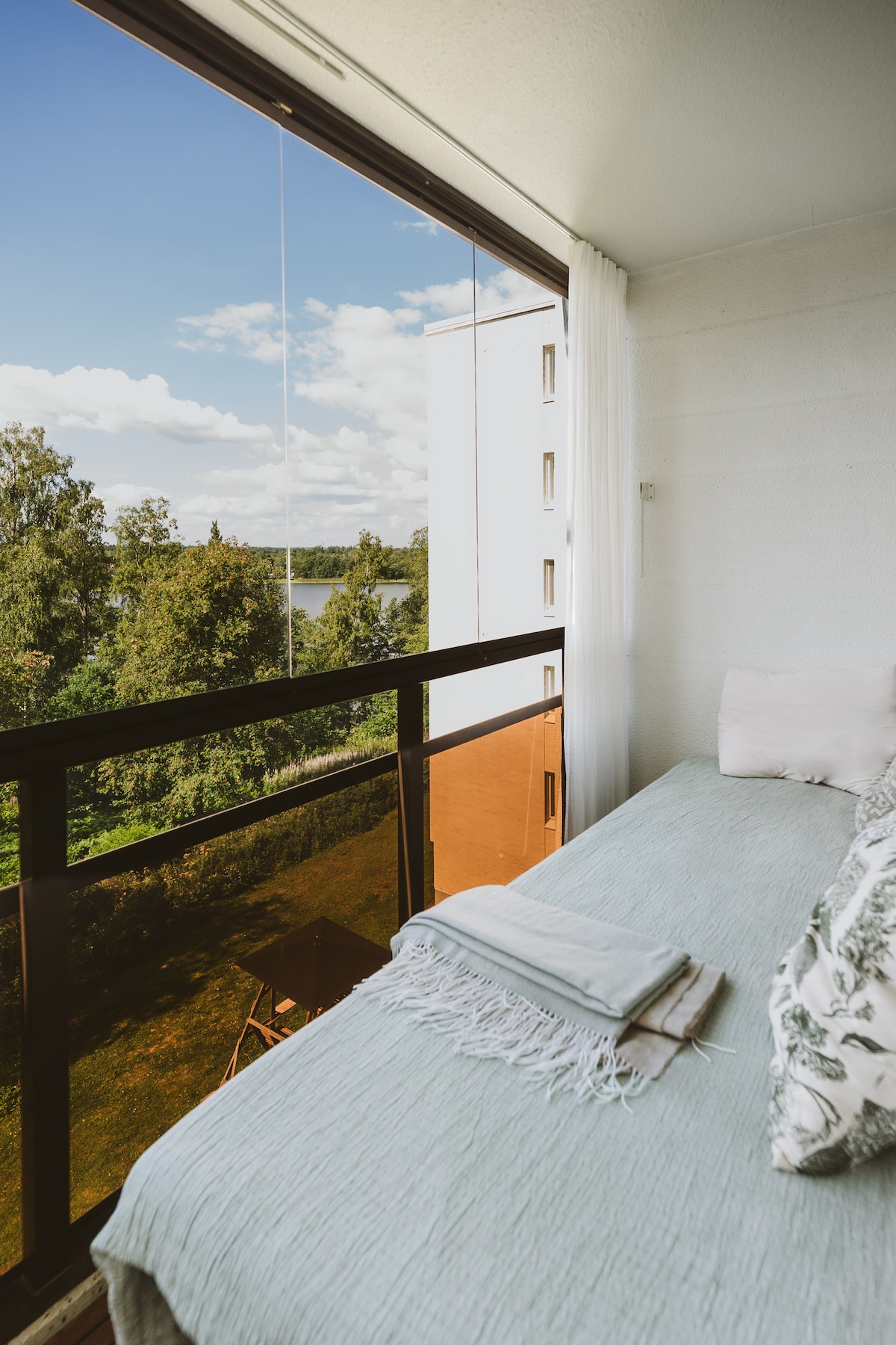 Moderne, klimatisierte 43,5 m² Wohnung im Turmgebäude neben der U-Bahn-Station Matinkylä und dem Einkaufszentrum Iso Omena (2018 Einkaufszentrum des Jahres NCSC). Tolle Aussicht auf die 16. Etage (14. Wohnetage) vom großen, voll verglasten Balkon mit Sitzbereich. Das Stadtzentrum von Helsinki ist nur 20 Minuten mit der U-Bahn entfernt. Ein Schlafzimmer mit Kingsize-Kontinentalbett (180 cm breit) und das modulare Wohnzimmersofa besteht aus 3 separaten 80 x 200 cm großen Betten mit einfachem Öffnungsmechanismus.