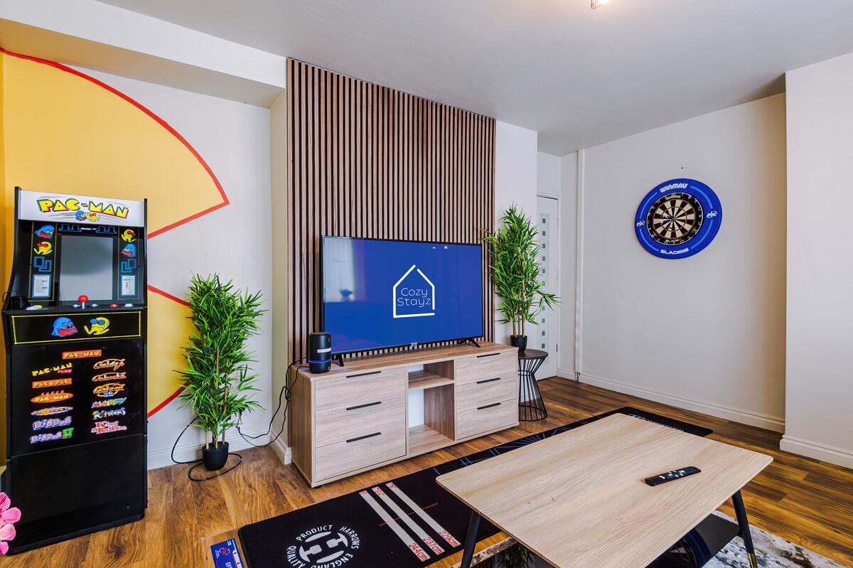 Übernachte komfortabel in diesem kürzlich renovierten modernen, umweltfreundlichen und seelenvollen Reihenhaus mit 2 Schlafzimmern in Clayton, Manchester. Günstig gelegen für die Straßenbahn, das Stadtzentrum, das Etihad-Stadion, Co-op Live und das NCC. Dieses moderne Juwel bietet gemütliche Wohnräume, eine elegante neue Küche mit eingebautem Fernseher und allen Komfort, den du für einen unvergesslichen Kurz- oder Langzeitaufenthalt benötigst. 🎱 Billardtisch 🌿 Privatgarten 🖥️ Spezieller Arbeitsplatz (140 MBit/s) 🅿️ Kostenlose Parkplätze 💤 Verdunklungsjalousien 🛌 Bettwäsche aus ägyptischer Baumwolle 📺 3 TVs