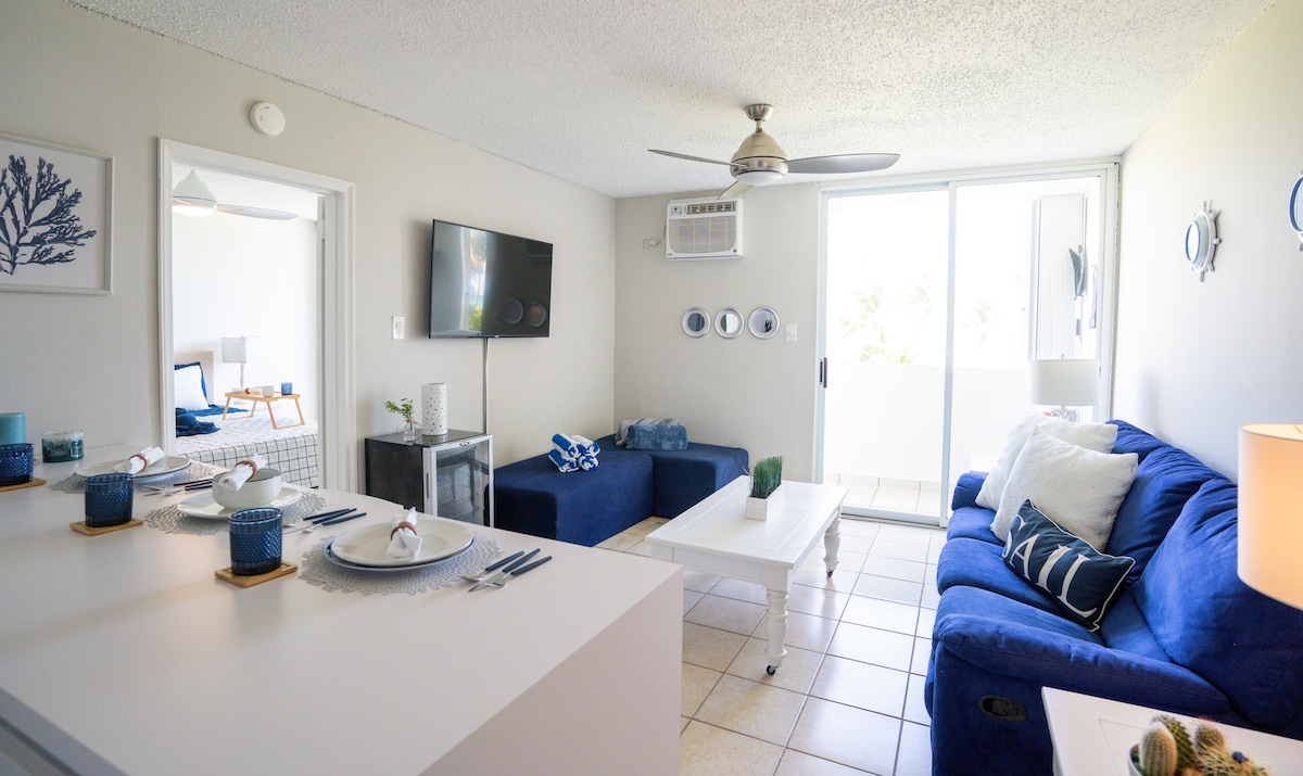 Schöne Wohnung ist für ein Paar oder für einen Alleinreisenden geeignet. Es ist sehr gemütlich und komfortabel. Die Küche mit Meerblick verfügt über alle Geräte. Ein separates Badezimmer und ein Schlafzimmer mit Klimaanlage und Kingsize-Bett. Ein gemütliches Wohnzimmer mit Sofa und Smart-TV. Private Insel mit Tennis, Basketball, Volleyball und zwei Swimmingpools. Zugang zum Strand. Fünf Minuten nach Fajardo mit der Fähre. Angel- und Segeltouren verfügbar. Bar-Restaurant auf der Insel. Perfekt für einen romantischen Kurzurlaub.