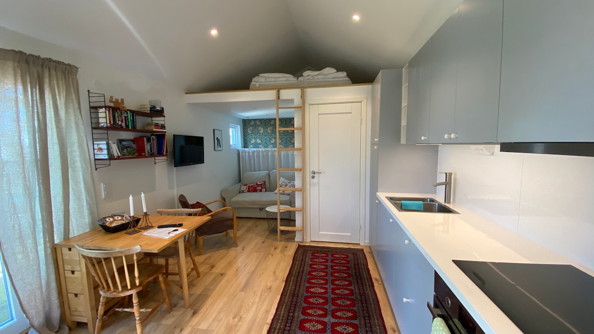 Charmantes Hinterhaus im Zentrum von Falkenberg. Das Gefühl, auf dem Land zu leben und trotzdem 300 m vom Stortorget entfernt zu sein. Eigener Außenbereich mit Grill und Parkplatz im Hof. Das Haus hat zwei Etagen - die obere mit drei bequemen Betten und die untere mit einer kleinen Küche und einem Essbereich, einem Sofa, TV mit Basisangebot und Bad. Tee und Kaffee sind in der Hütte vorhanden. Frühstück/Frühstücksbrötchen finden Sie in der angrenzenden Bäckerei. WLAN Toilettenpapier, Küchenpapier, Spülmittel, Seife und Shampoo stehen Ihnen zur Verfügung. Spricht Schwedisch, Englisch, Französisch.