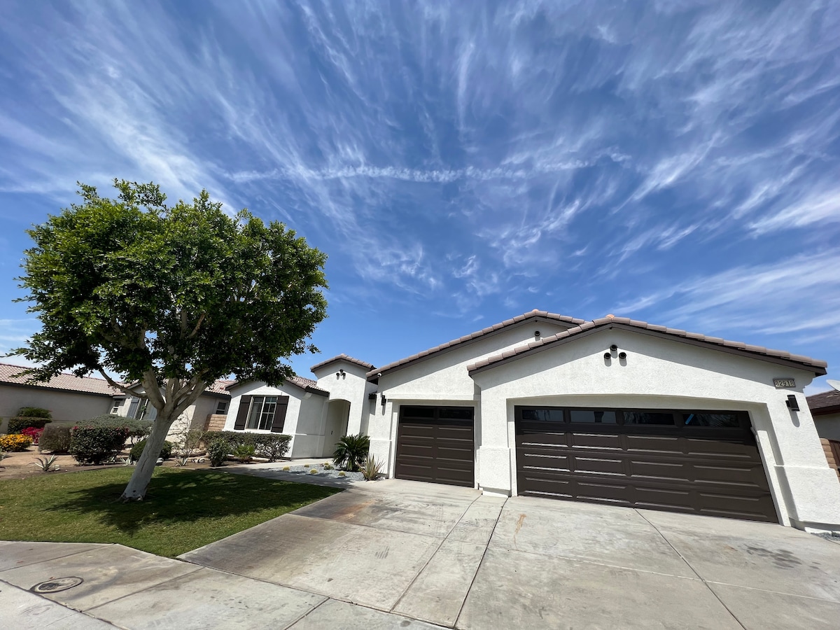 Geräumiges hundefreundliches Haus mit privatem beheiztem Pool, Billardtisch, Whirlpool-Badewanne, sehr bequemen Betten, großem Garten, überdachter Terrasse, Gasgrill, 65-Zoll-Smart-TV, riesigem Familiensofa, EV-Ladegerät, 500 MB WLAN. In der Nähe von Weltklasse-Golf, Tennis, Coachella-Musikfestival, Innenstadt von Palm Springs, Luftbahn, malerisches Wandern, Living Desert Zoo. Poolheizung: Kostenlos Mai-Okt. und 50 €/Tag oder 1100 €/Monat Nov.-April. Hunde müssen bei der Buchung ausgewählt werden.