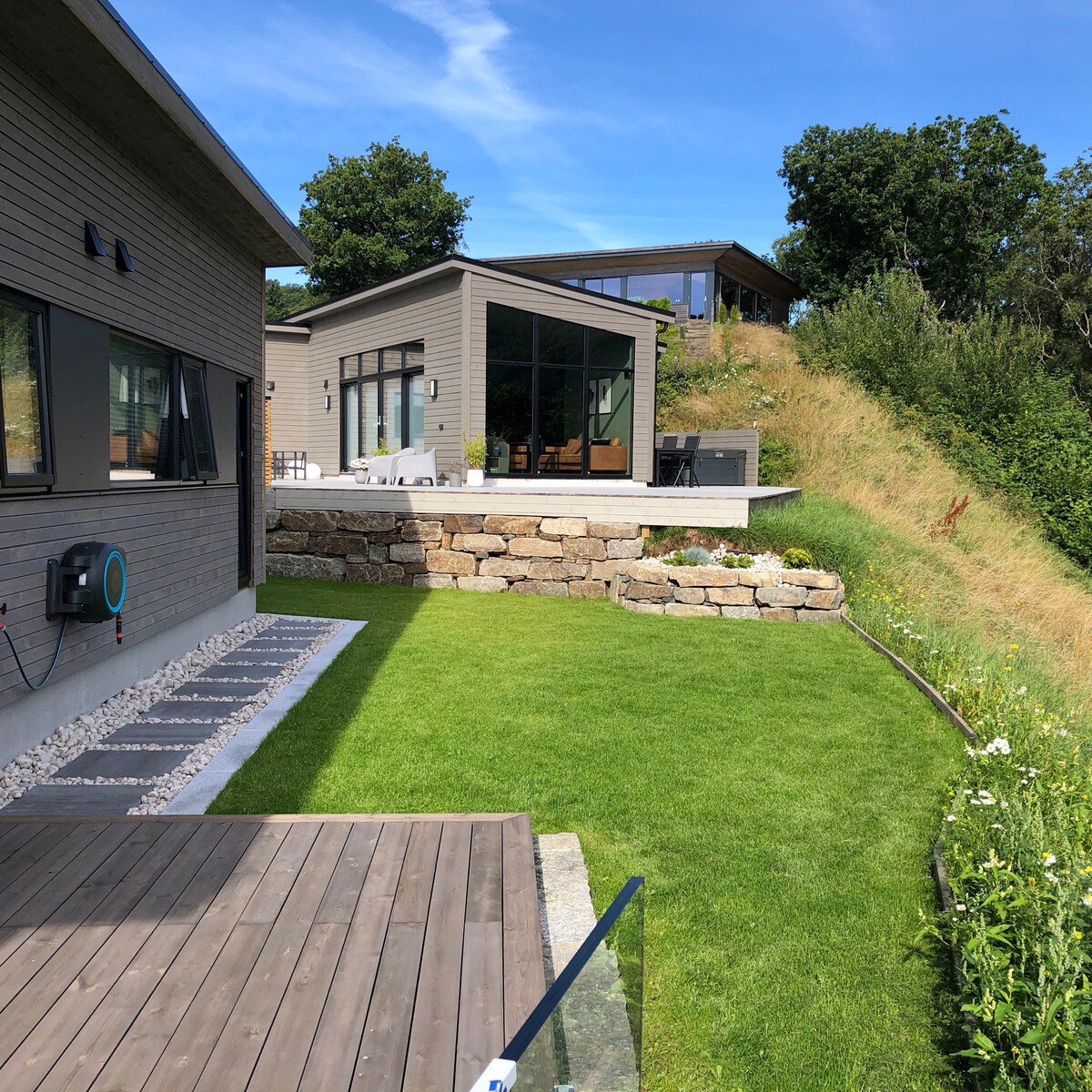 Våre gjester bemerker den fantastiske utsikten som gir ro, hagen som gir frihet og vårt ønske om at gjestene skal ha et topp opphold. Se tilbakemeldingene fra våre gjester. Hytta er moderne med høy kvalitet på alle materialer, og design møbler. Hytta er bygget for familiebruk, men leies ut i påvente av at våre barn skal benytte denne. Hytta ligger i et kulturhistorisk område fra seilskute- og kapertiden. Det er gode turmuligheter i nærområdet, nærhet til fantastiske sandstrender.